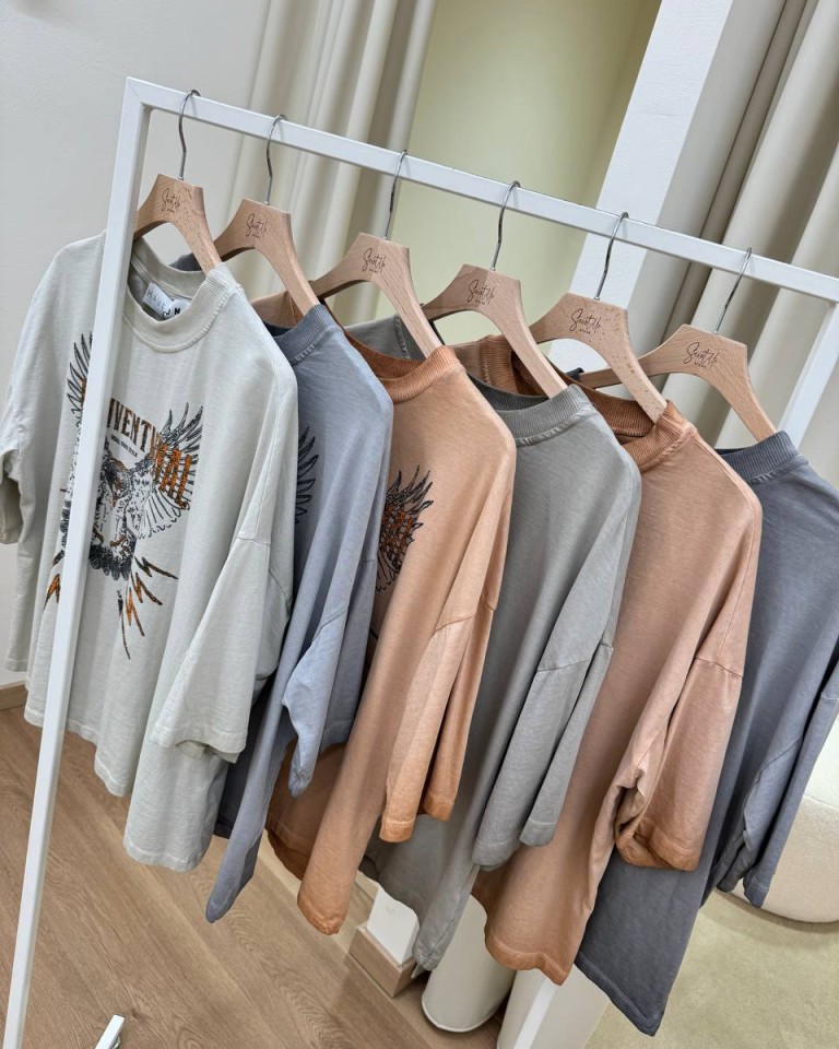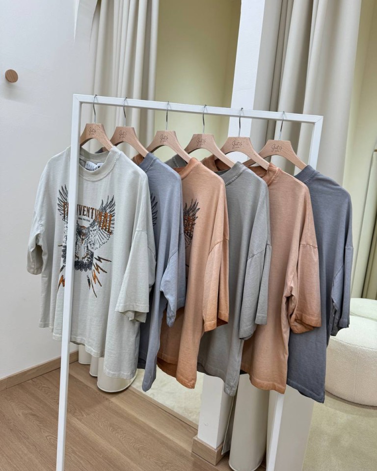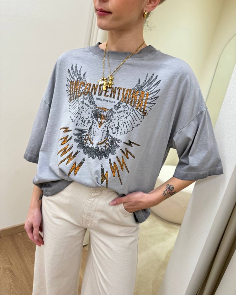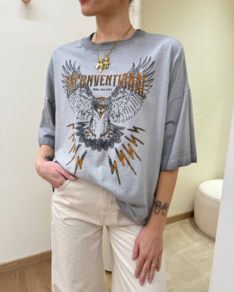 T-shirt grigia sfumato con stampa aquila. Modello oversize a mezze maniche, girocollo. Vestibilità ampia.