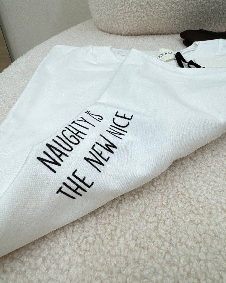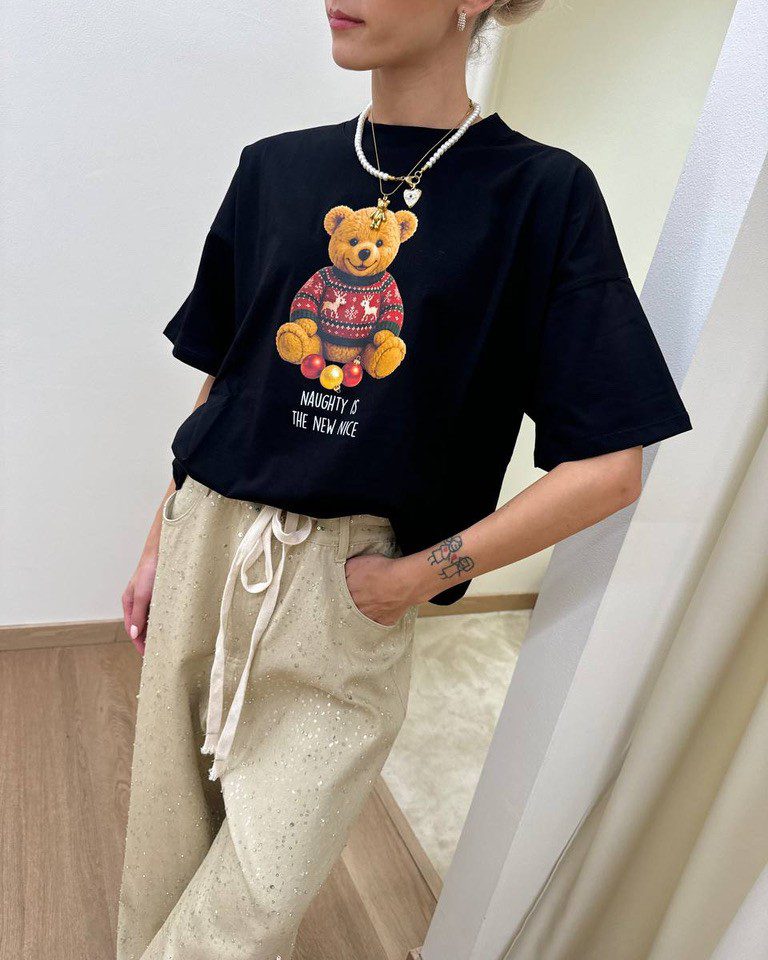 T-shirt girocollo nera con stampa orsetto natalizio e scritta “Naughty is the new nice”. Modello dal fit oversize.