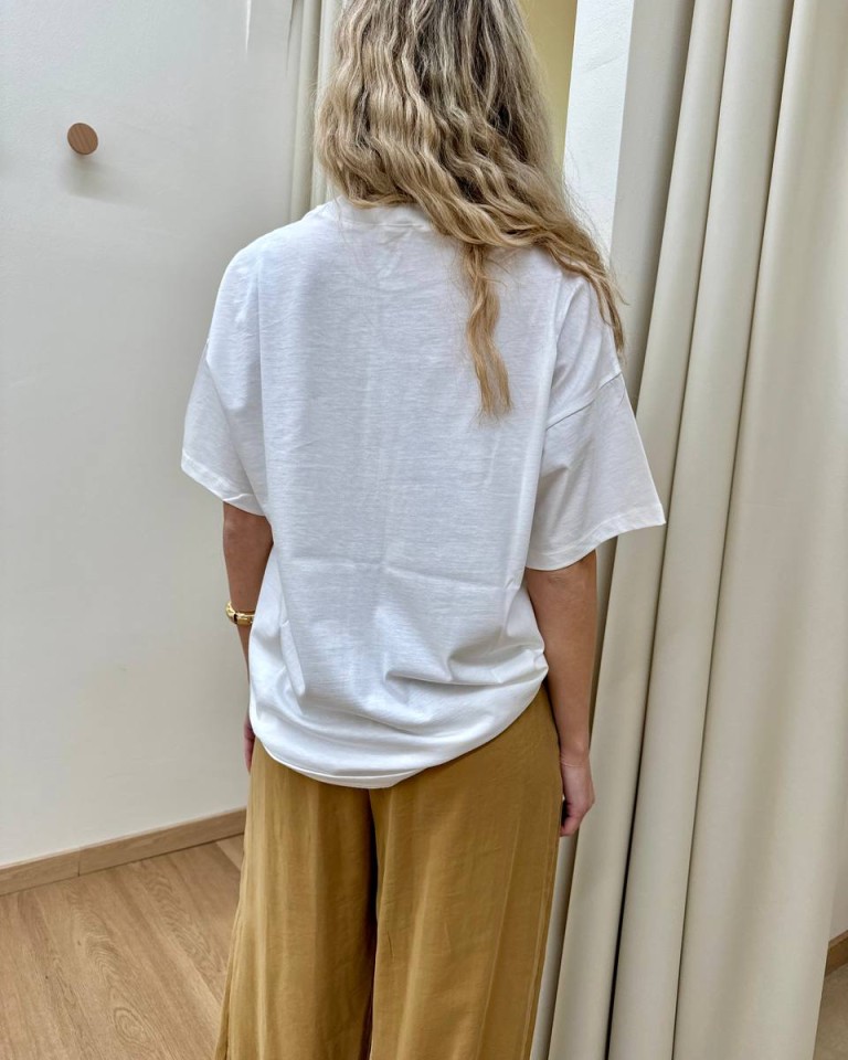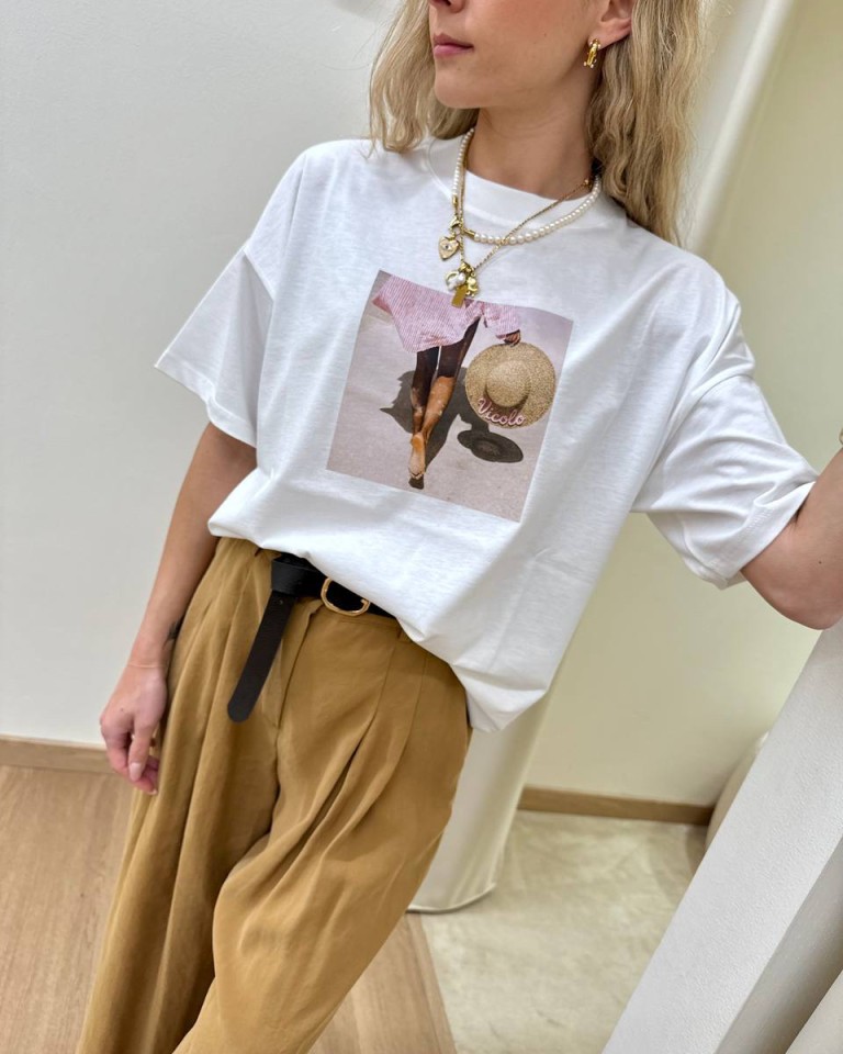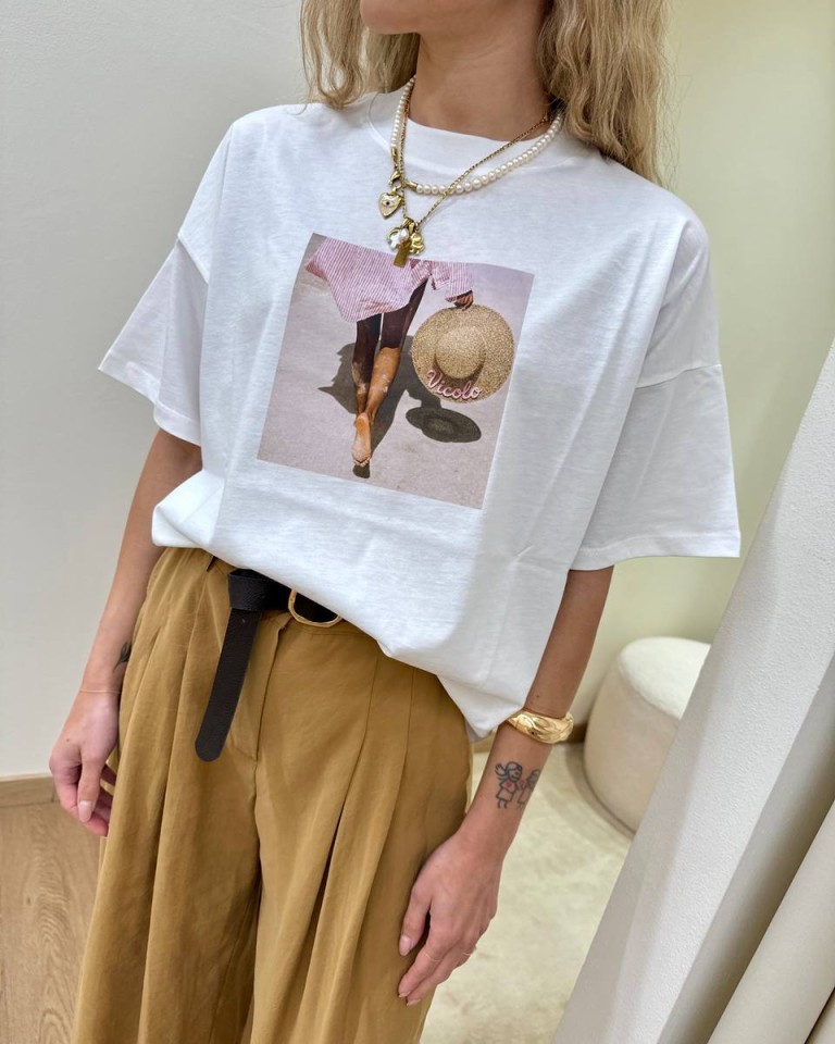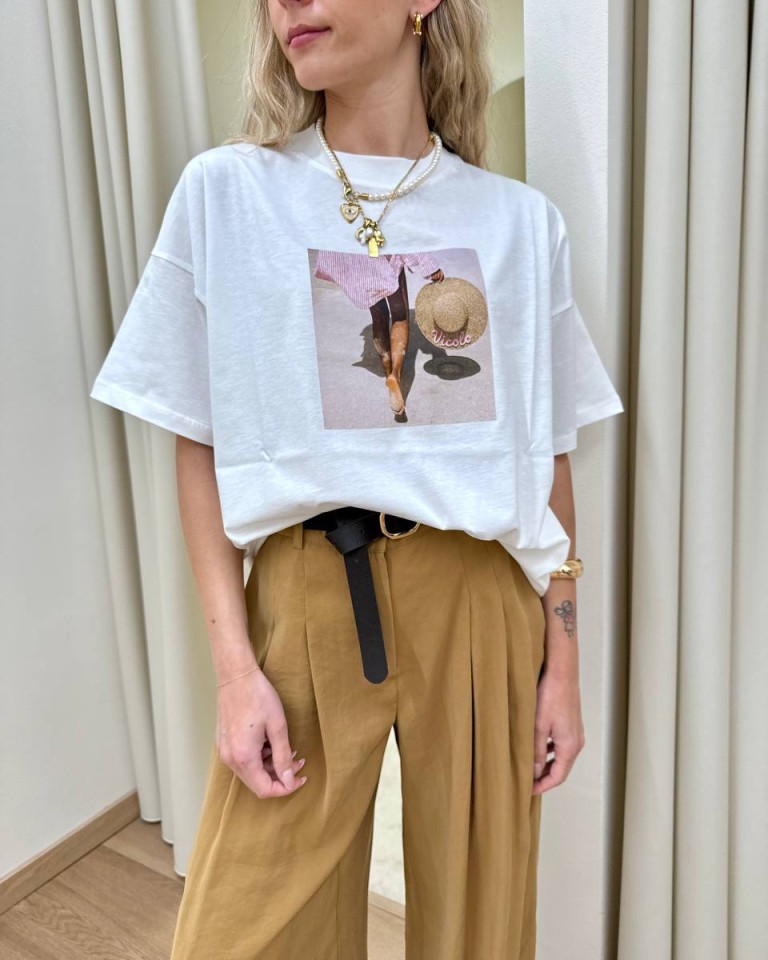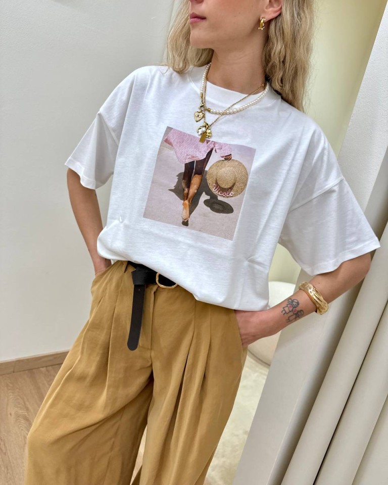 T-shirt panna con stampa foto spiaggia, modello basic oversize, girocollo con maniche corte ampie e scese. Vestibilità ampia.