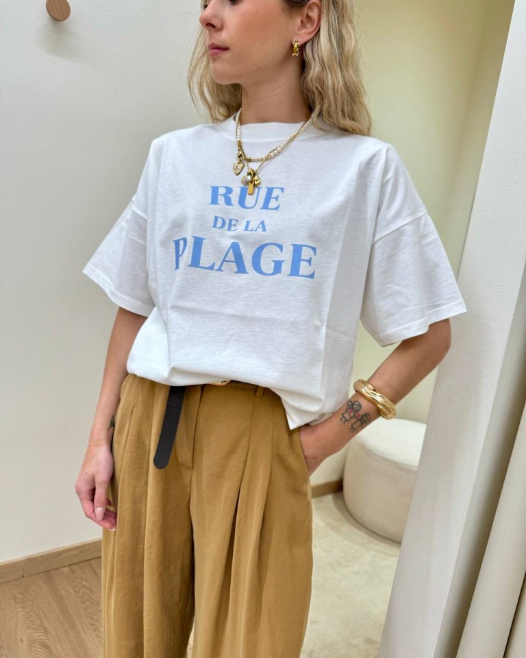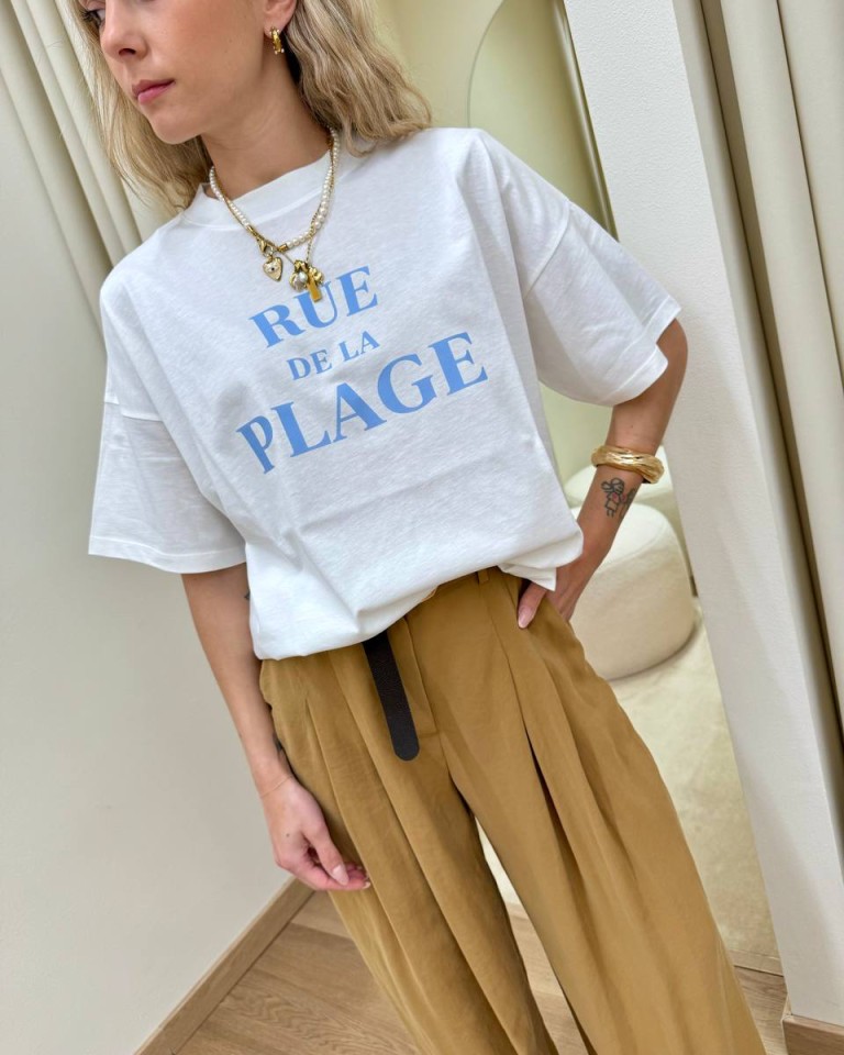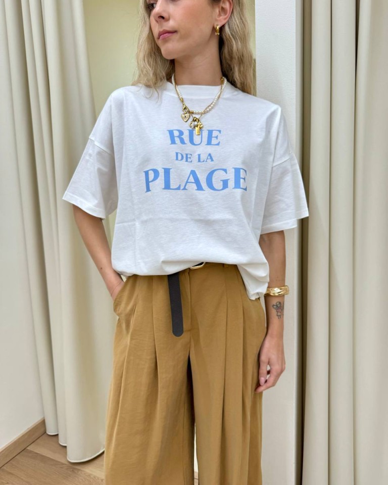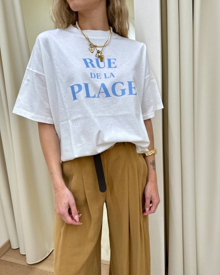 T-shirt panna stampa “Rue de la Plage”, modello basic oversize, girocollo con maniche corte ampie e scese. Vestibilità ampia.