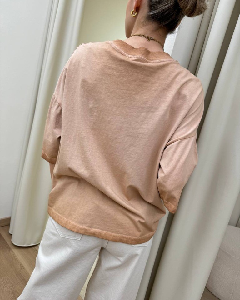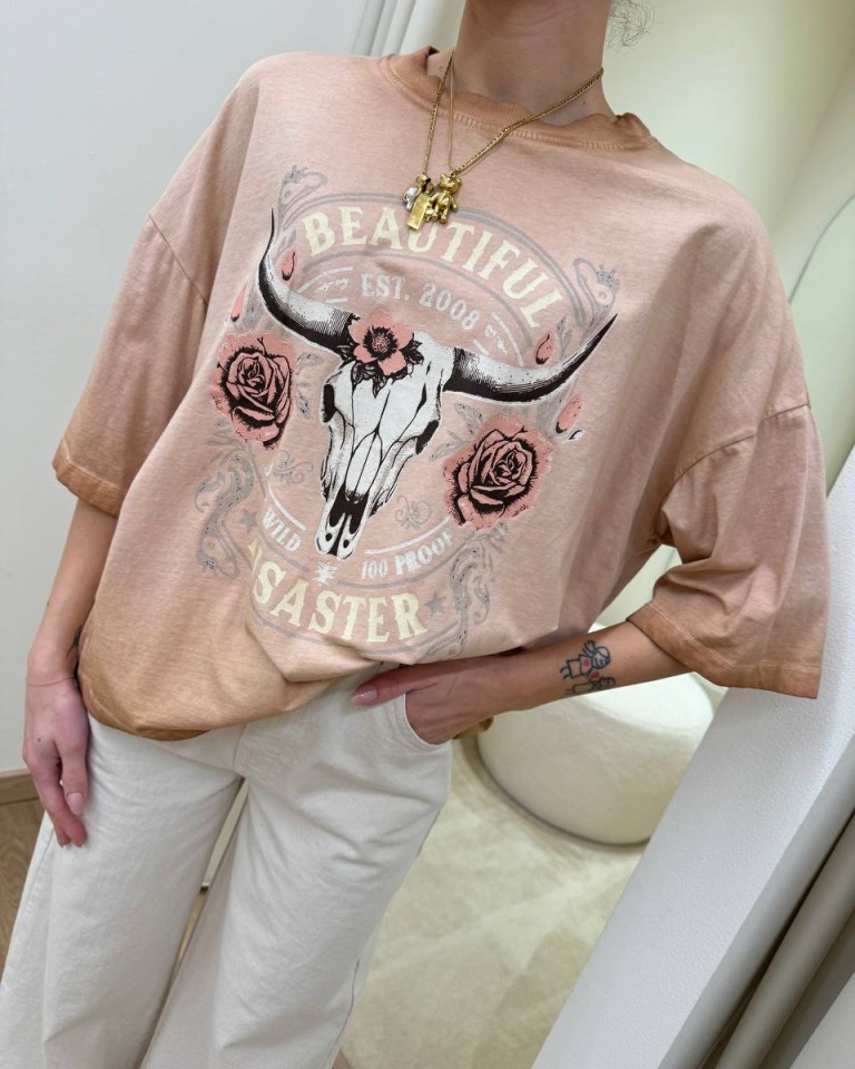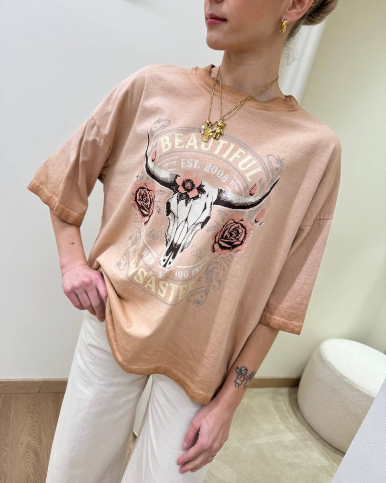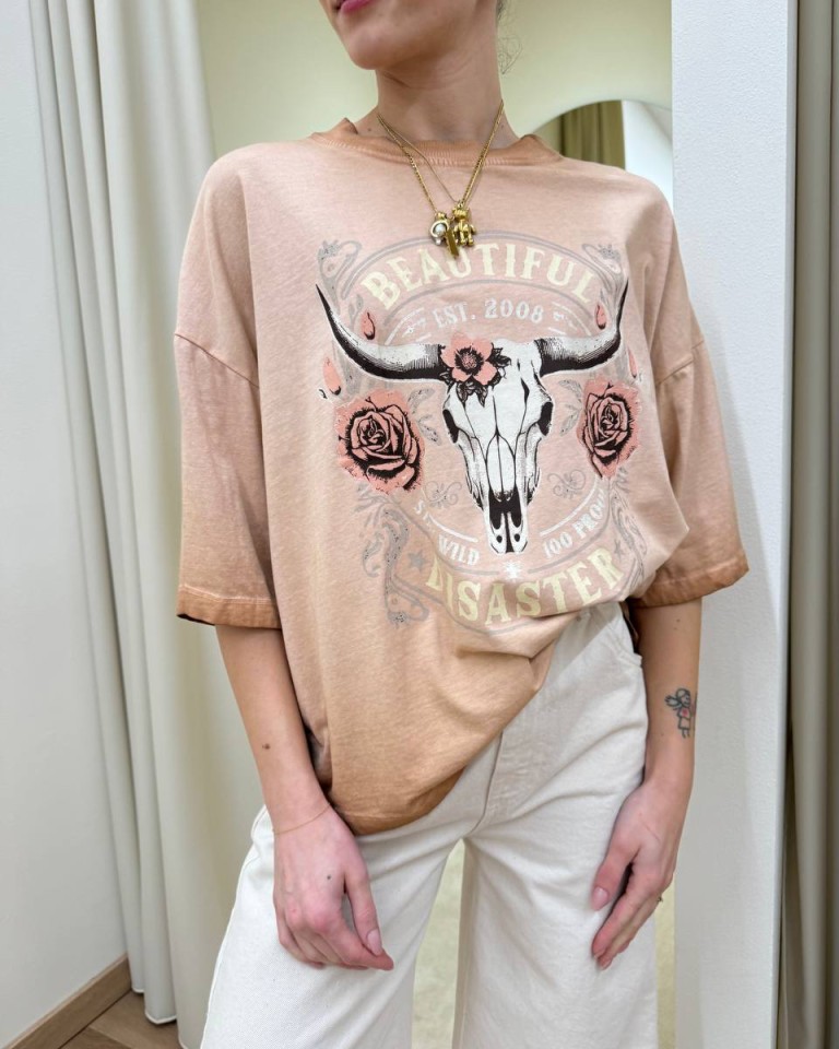 T-shirt color pesca sfumato con stampa teschio, rose e scritta “beautiful disaster”. Modello oversize a mezze maniche, girocollo. Vestibilità ampia.