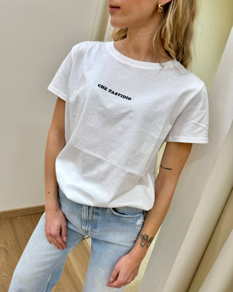 T-shirt bianca ricamo nero “Che Fastidio”, modello basic, girocollo con maniche corte. Vestibilità regolare.