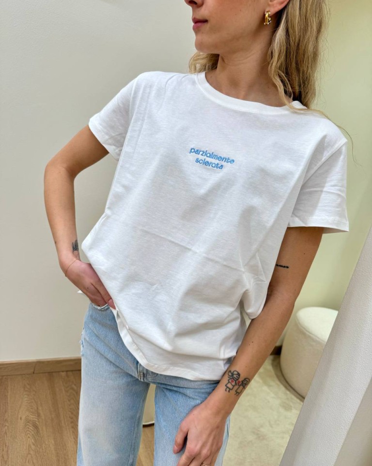 T-shirt bianca ricamo celeste “Parzialmente Sclerata”, modello basic, girocollo con maniche corte. Vestibilità regolare.