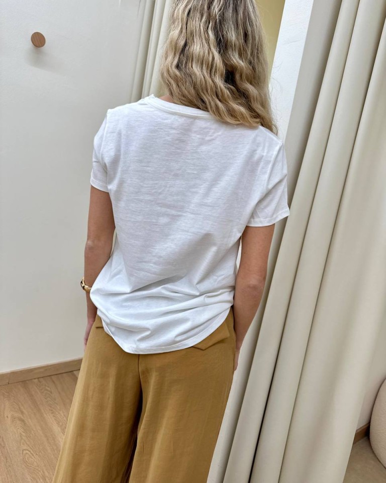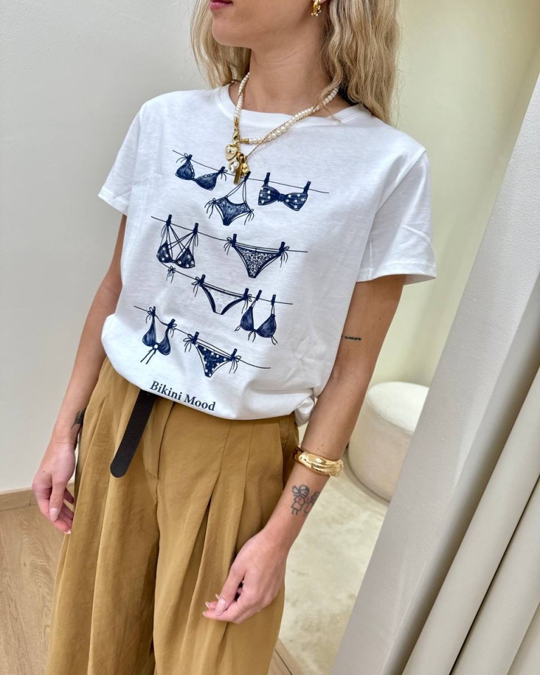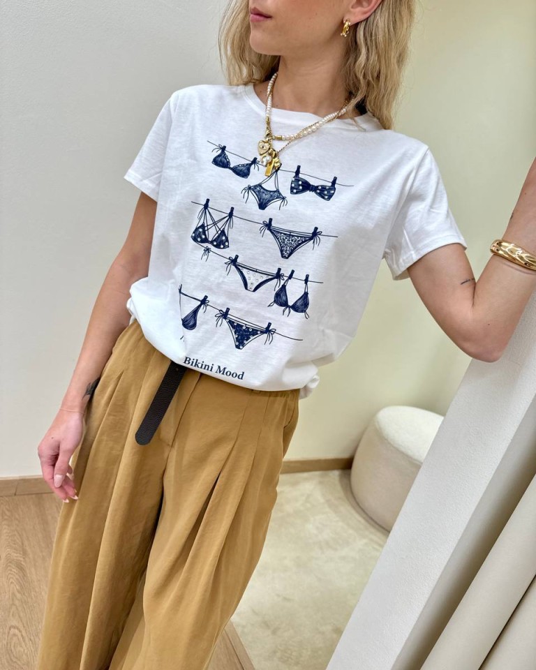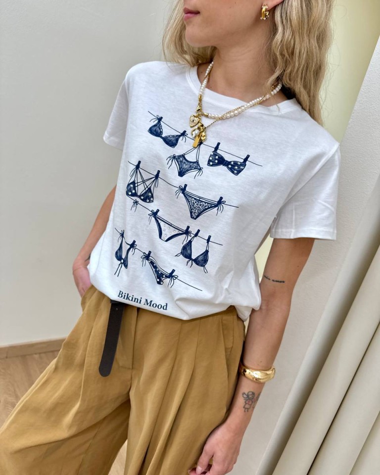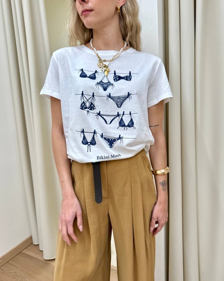 T-shirt panna con stampa blu “Bikini Mood” e strass, modello basic, girocollo con maniche corte. Vestibilità regolare.
