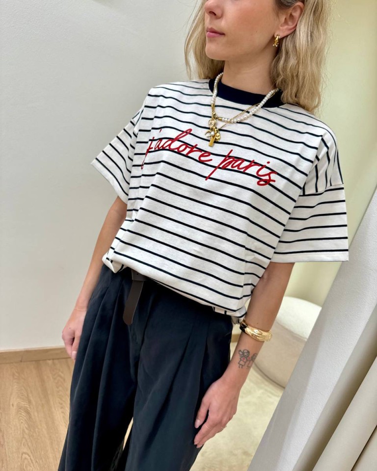 T-shirt panna a righe blu scuro con scritta “j’adore paris” rossa, modello over a scatoletta con maniche corte e giro sceso, girocollo a costine. Vestibilità ampia.