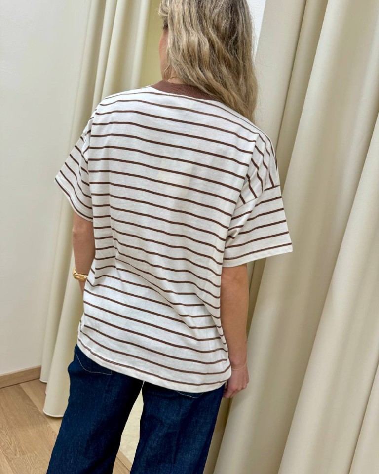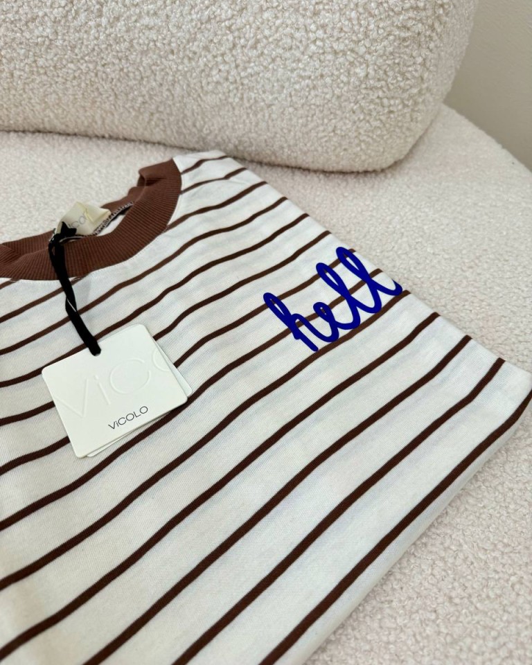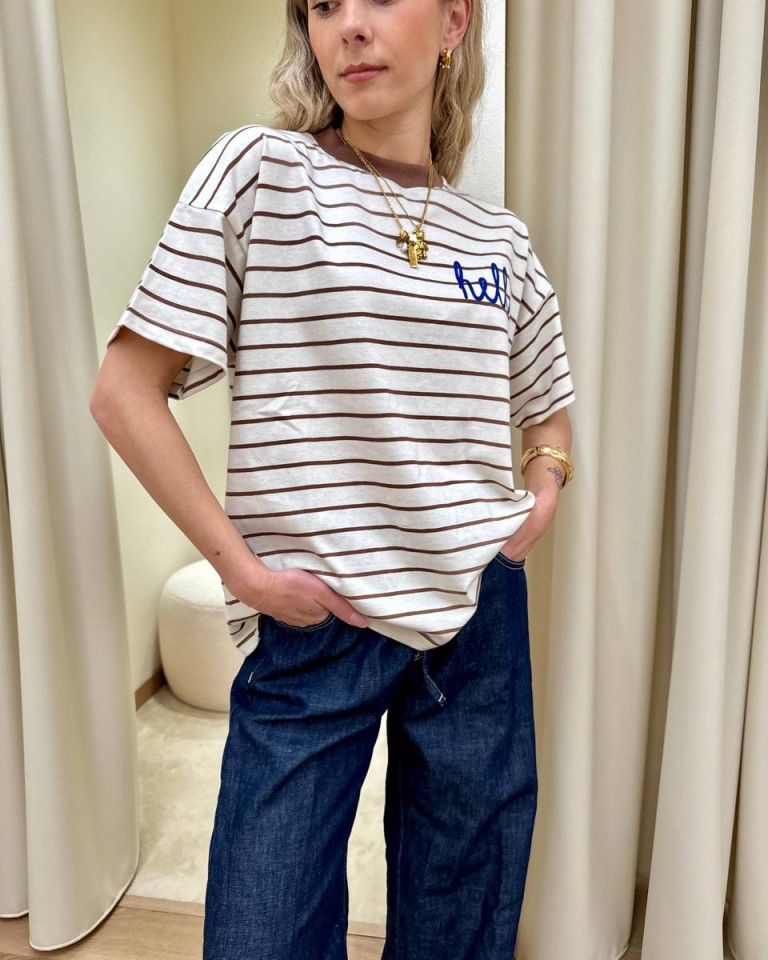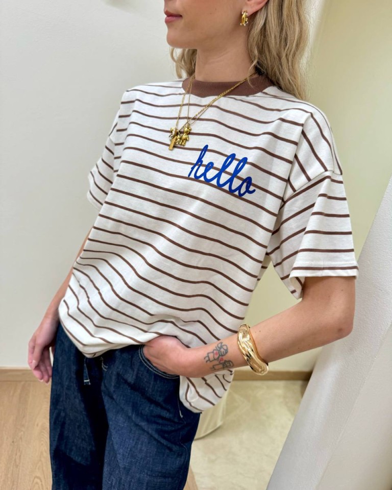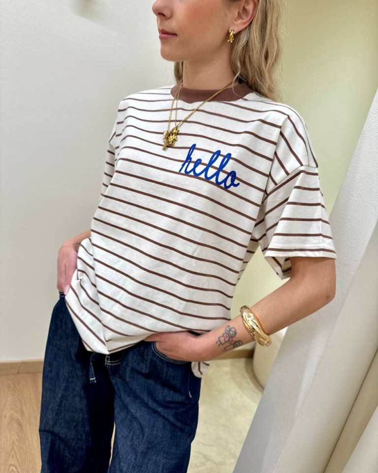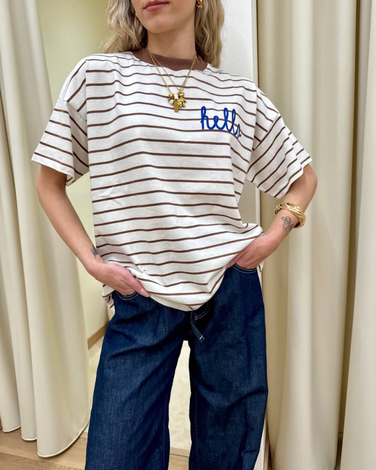 T-shirt panna a righe tabacco con stampa scritta “hello” blu, modello over a scatoletta con maniche corte e giro sceso, girocollo a costine. Vestibilità ampia.
