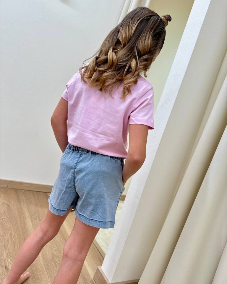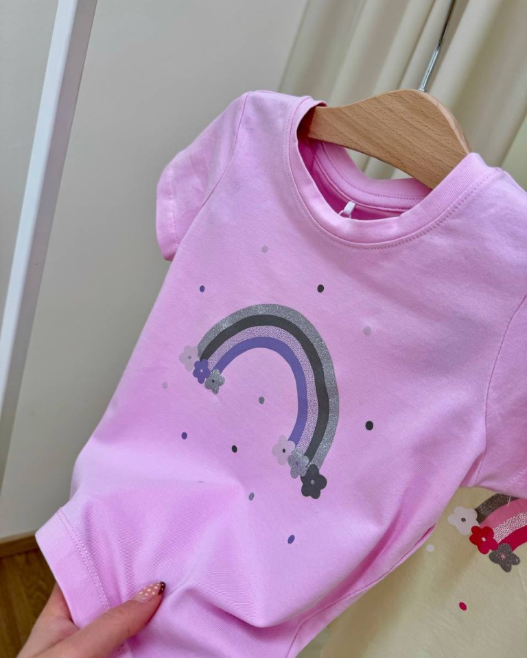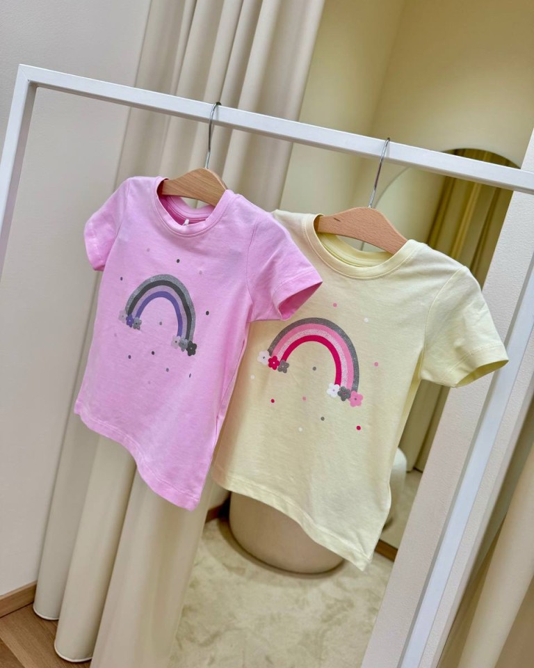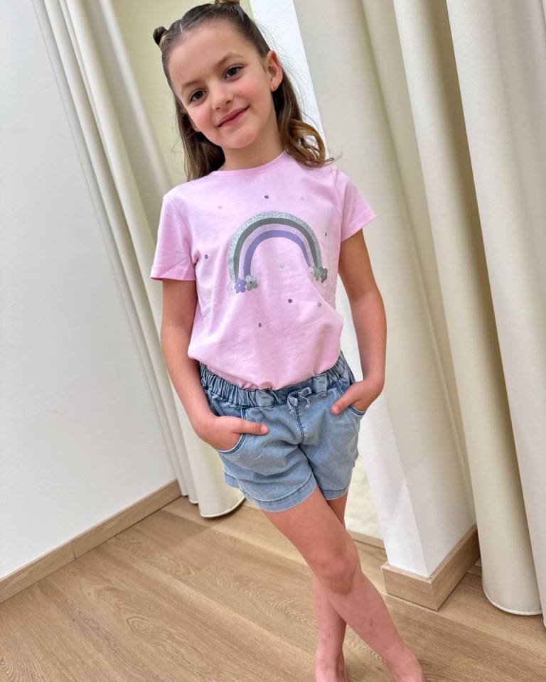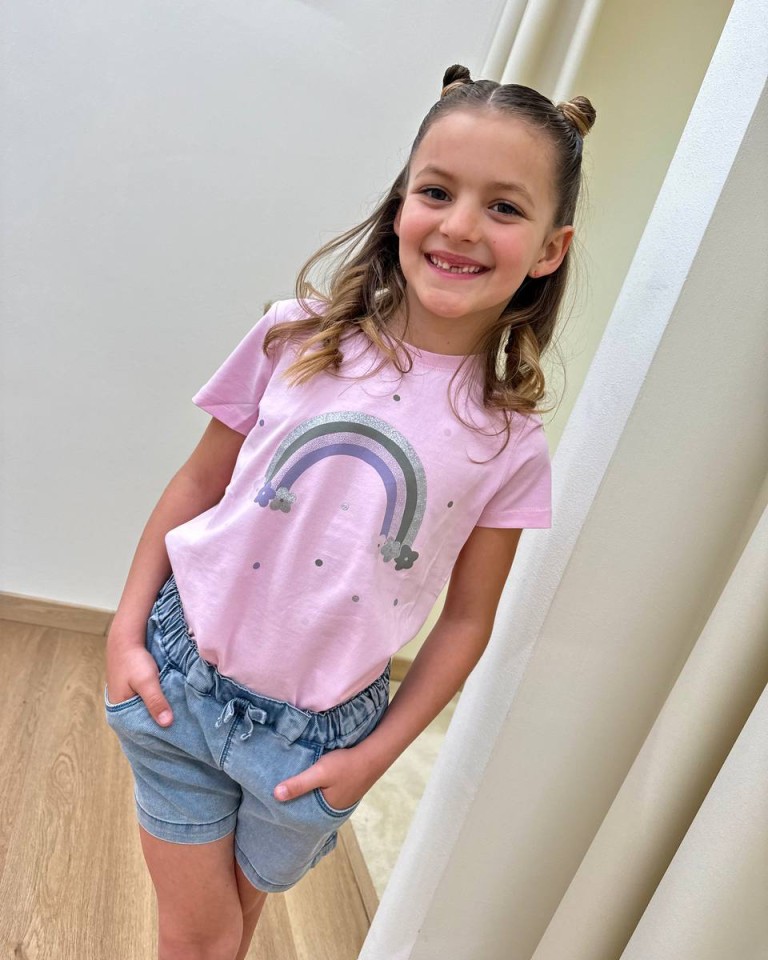 T-shirt rosa pastello con stampa arcobaleno glitterata, modello basic maniche corte e girocollo. Vestibilità regolare.