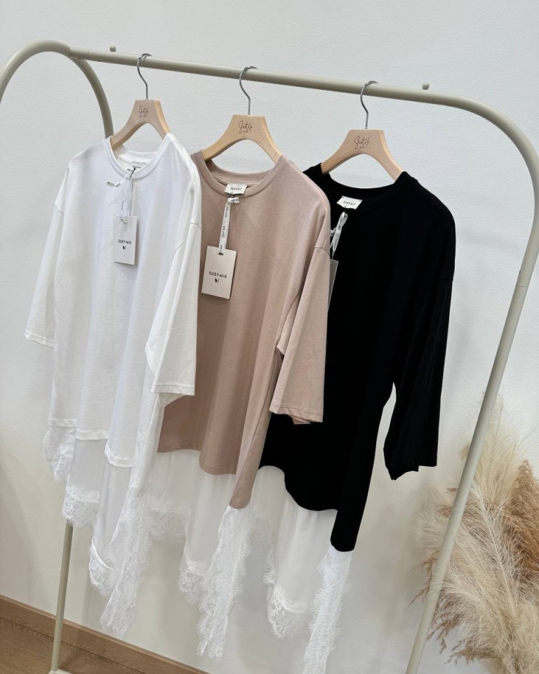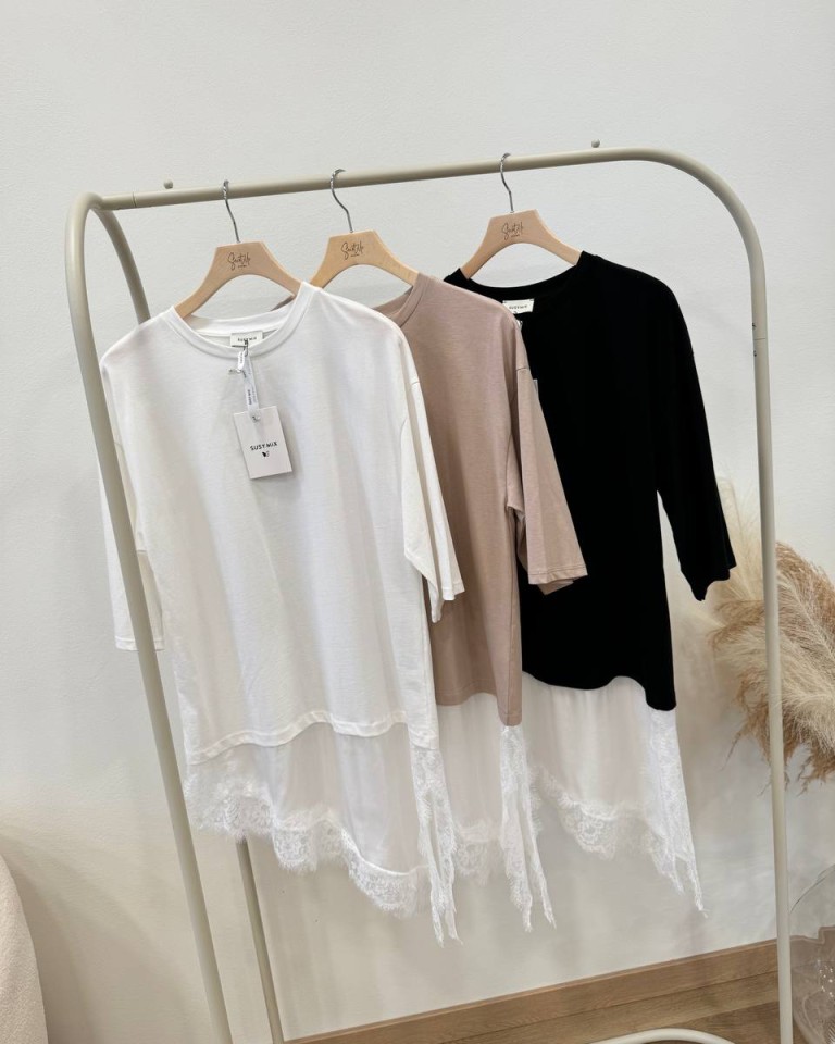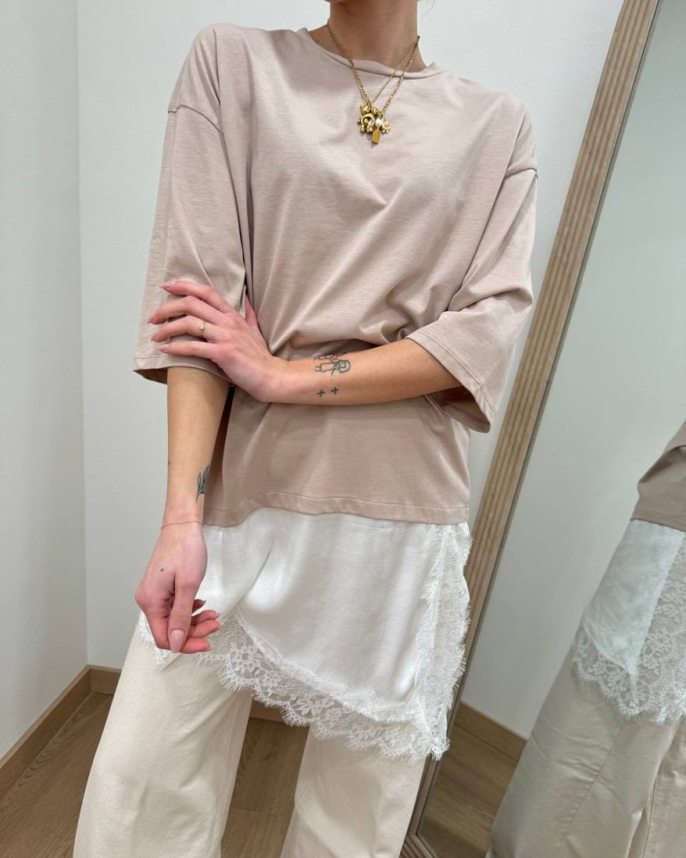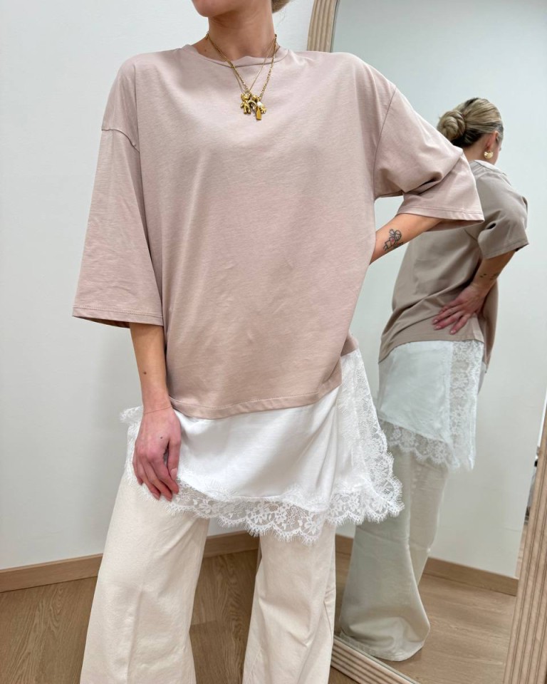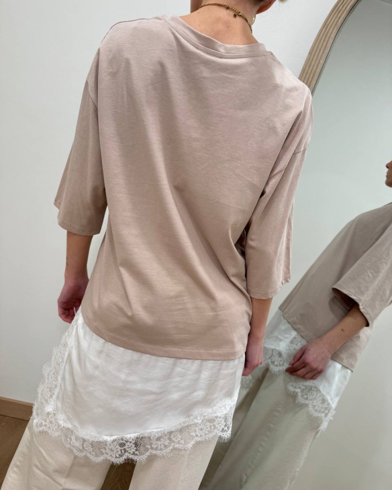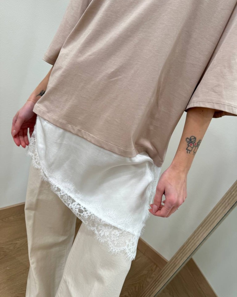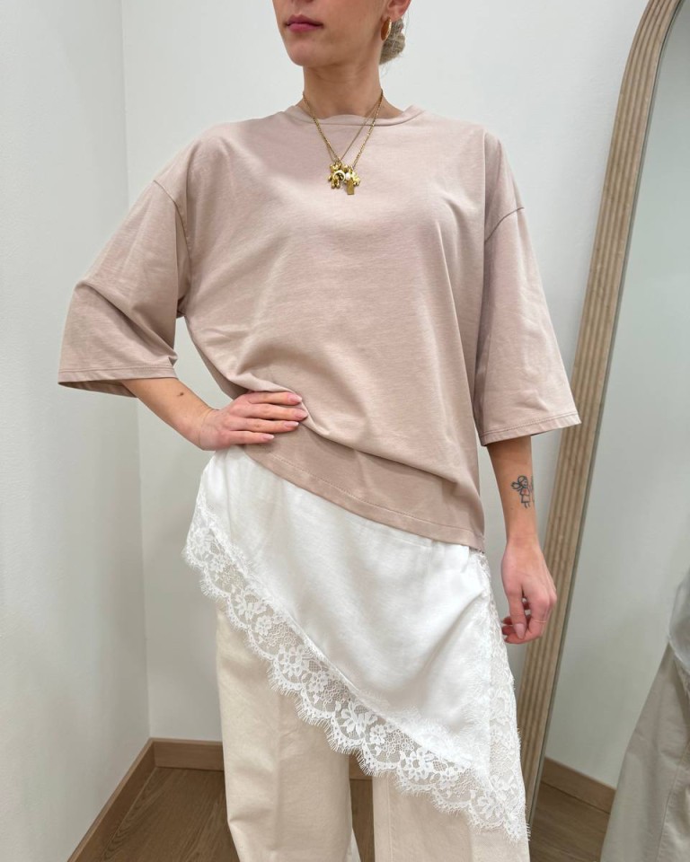 T-shirt sabbia, modello girocollo, oversize e lunga con inserto asimmetrico bianco e orlo in pizzo. Vestibilità ampia.