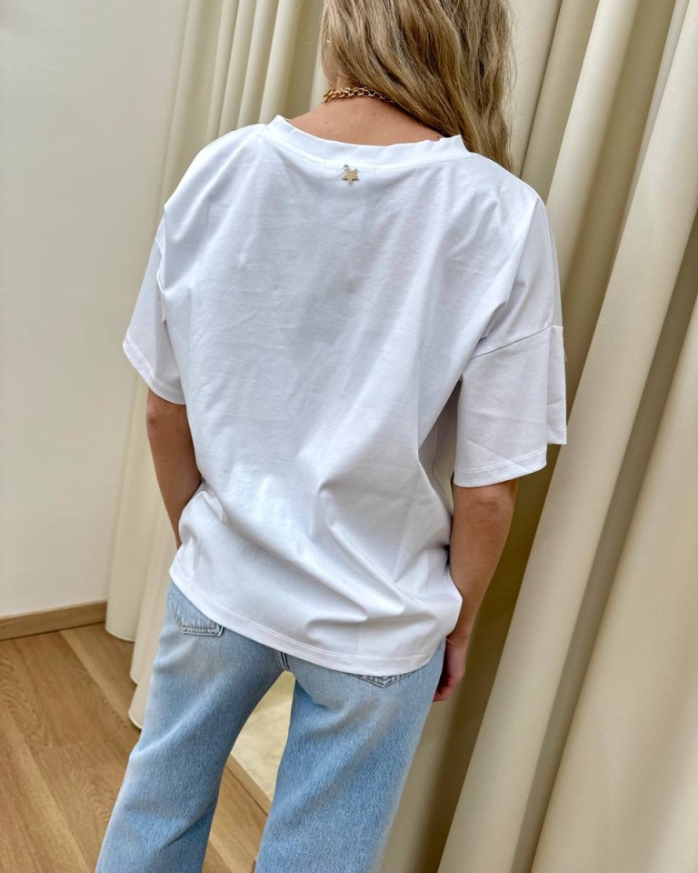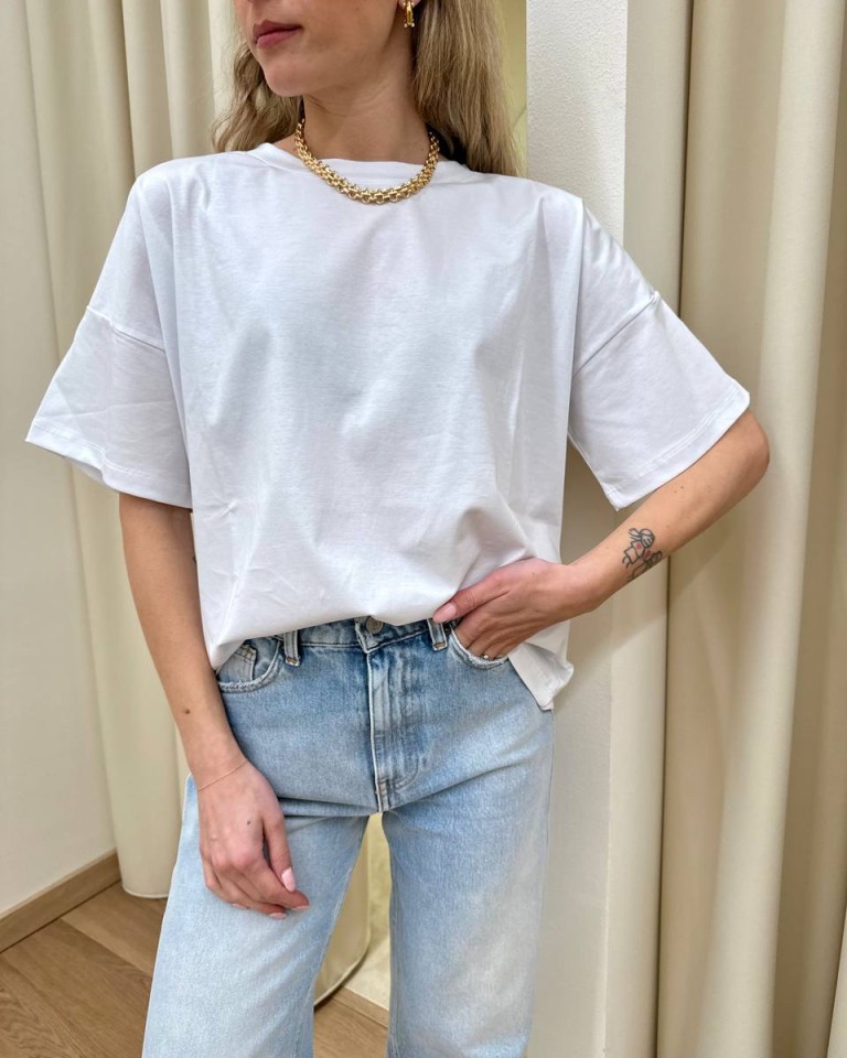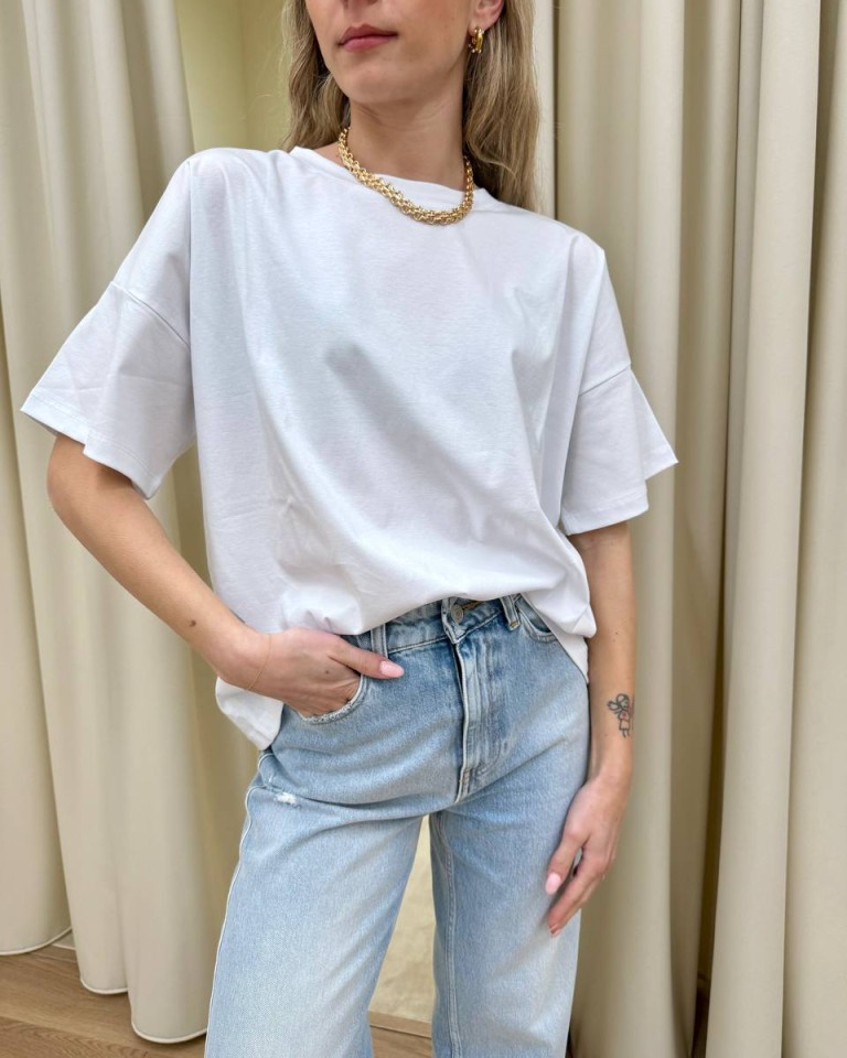 T-shirt bianca, modello basic a scatoletta, girocollo, manica corta e giro sceso. Vestibilità ampia.