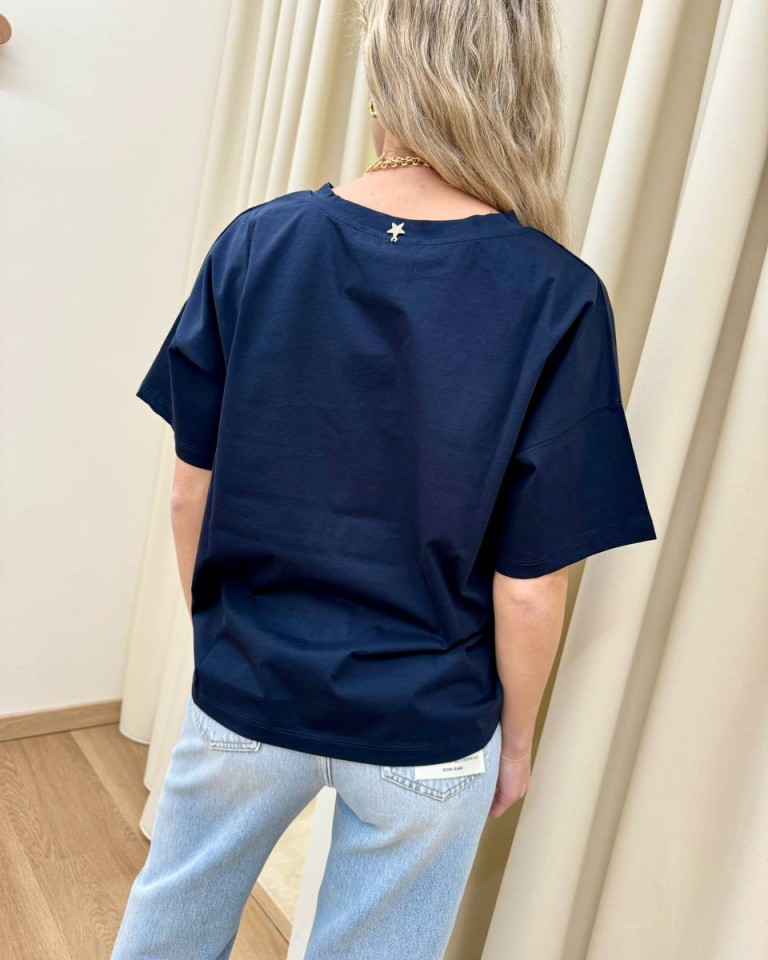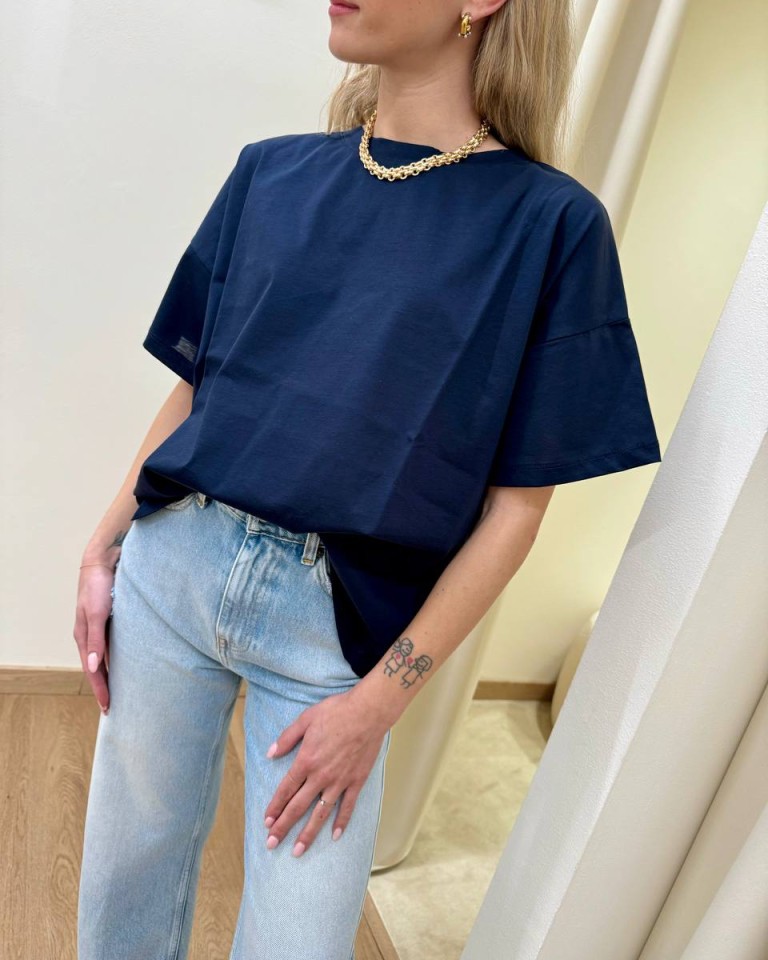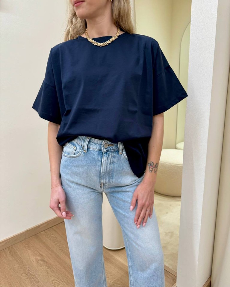 T-shirt blu scuro, modello basic a scatoletta, girocollo, manica corta e giro sceso. Vestibilità ampia.