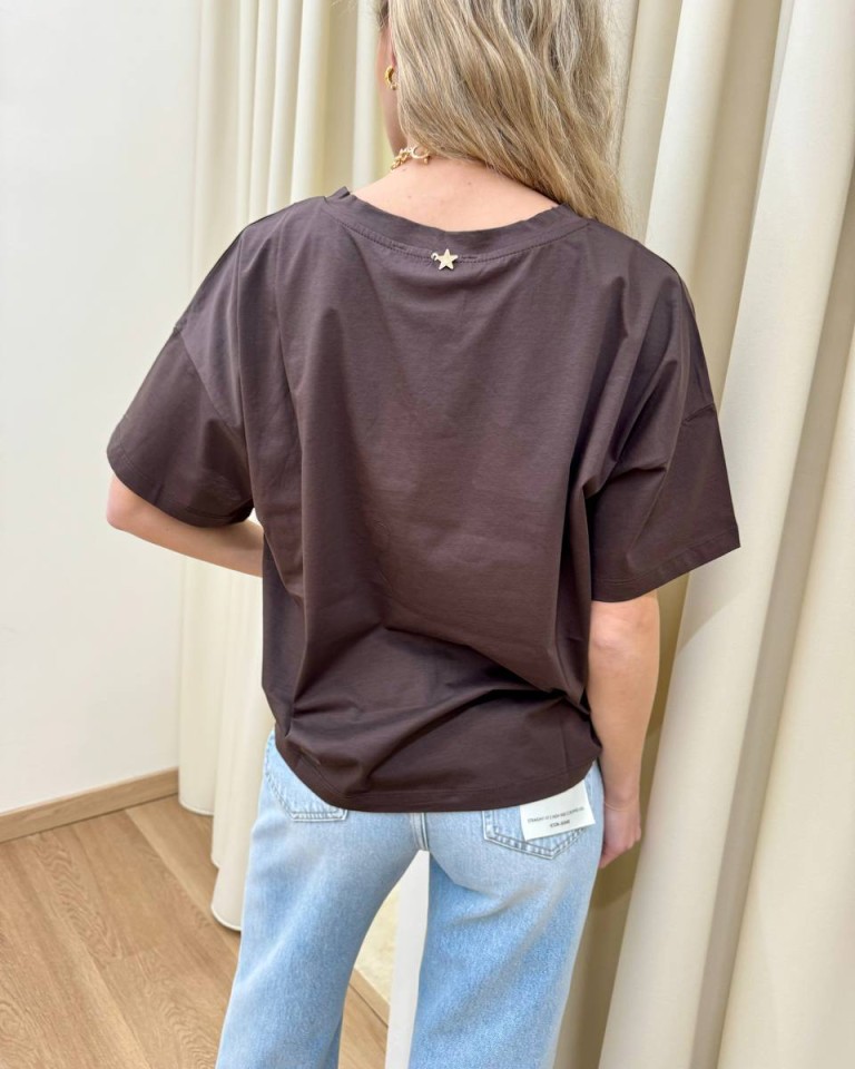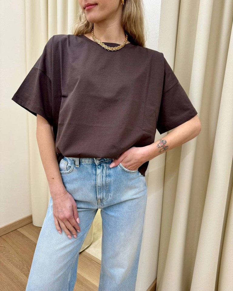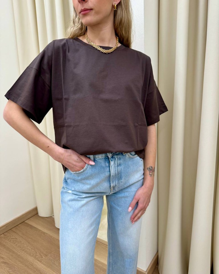 T-shirt moro, modello basic a scatoletta, girocollo, manica corta e giro sceso. Vestibilità ampia.