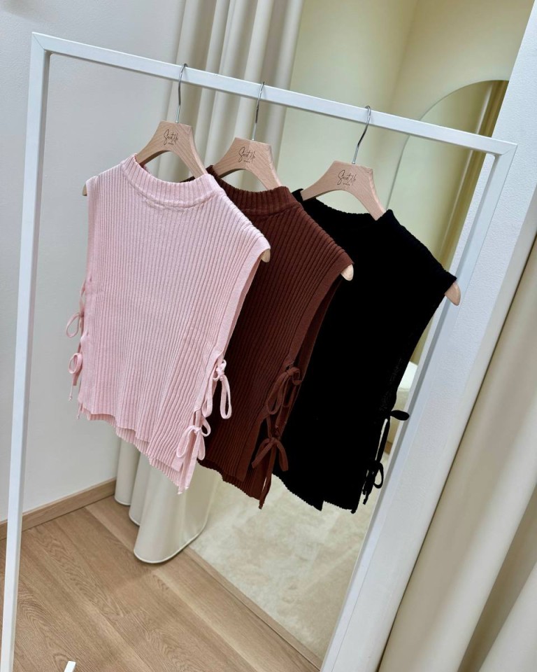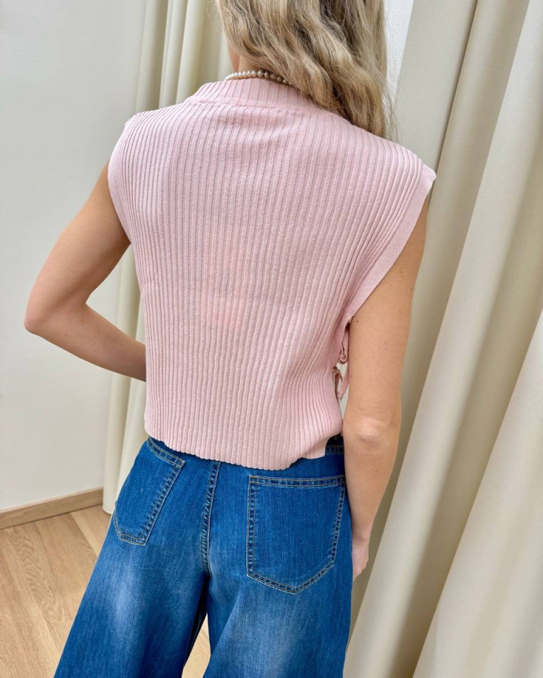 Top in maglia a costine rosa pastello. Modello dritto collo alto con aperture laterali chiuse da laccetti. Vestibilità regolare.