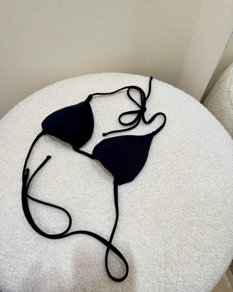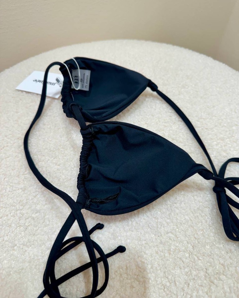 Top bikini Kate nero tinta unita, modello a triangolo con laccetti regolabili e coppe estraibili. Vestibilità regolare, se si oscilla tra due taglie consigliamo la taglia sopra.