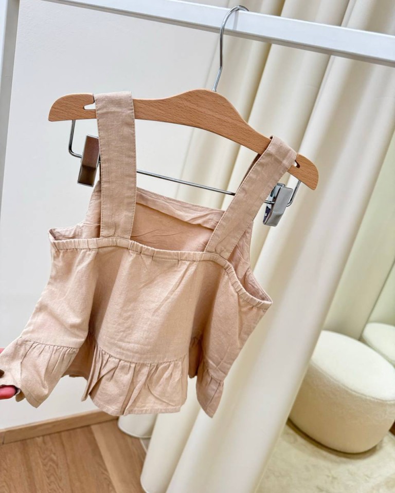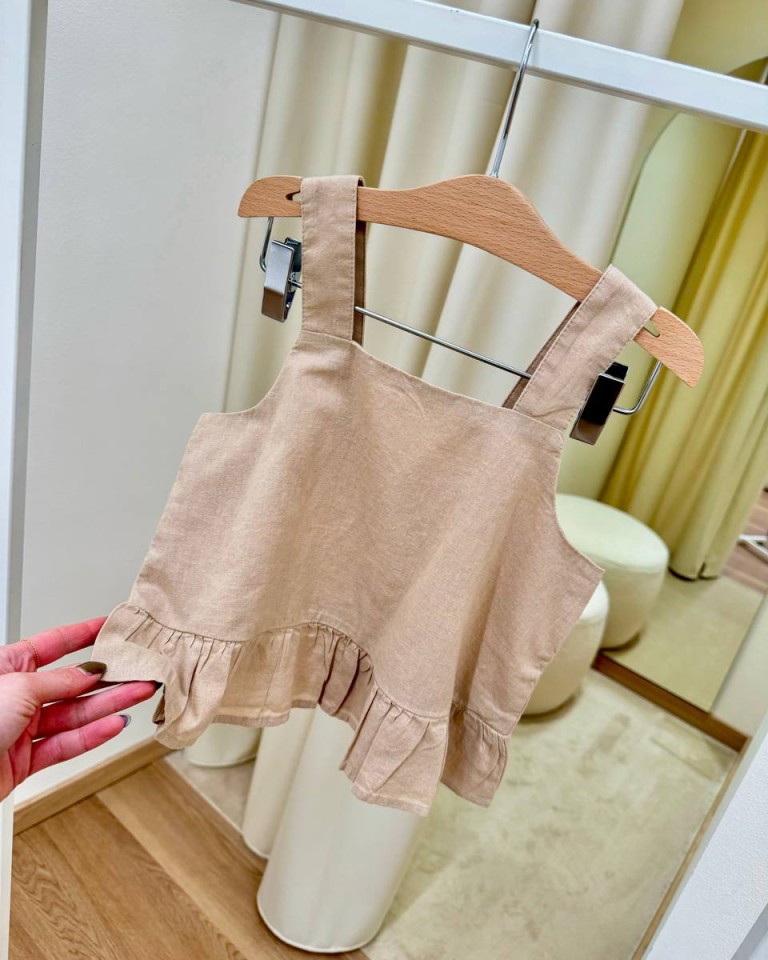 Top beige con scollo dritto, spalline larghe e gala arricciata in vita. Vestibilità regolare.