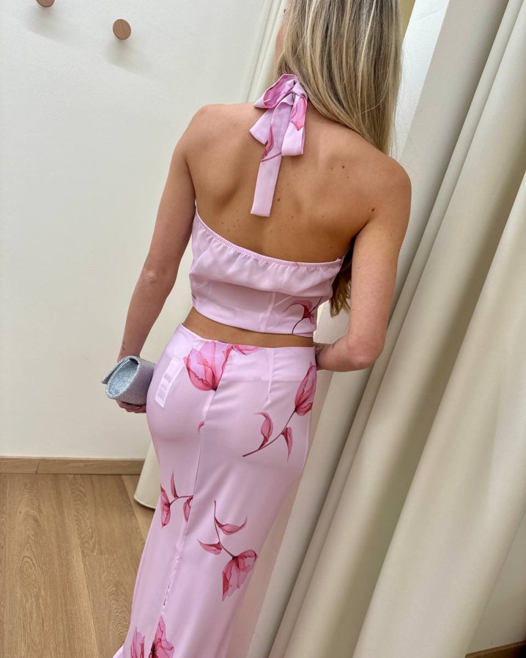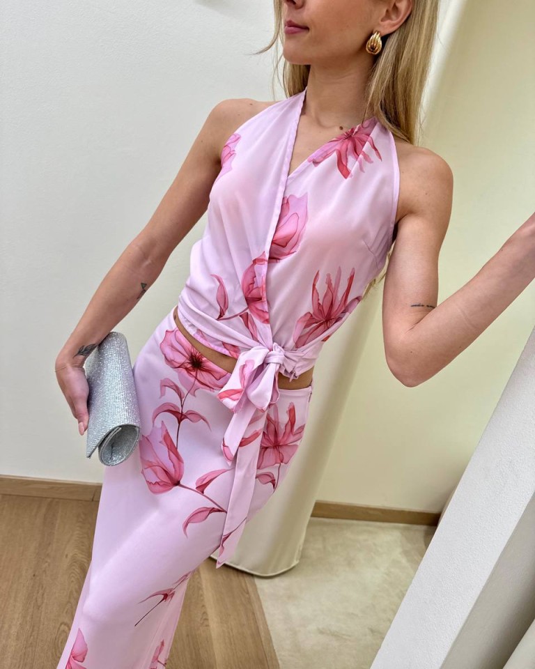 Top in georgette rosa chiaro con stampa fiori, modello corto con scollo all’americana allacciato al collo con fiocco e incrociato davanti con nodo in vita. Chiusura laterale con zip invisibile. Vestibilità regolare.