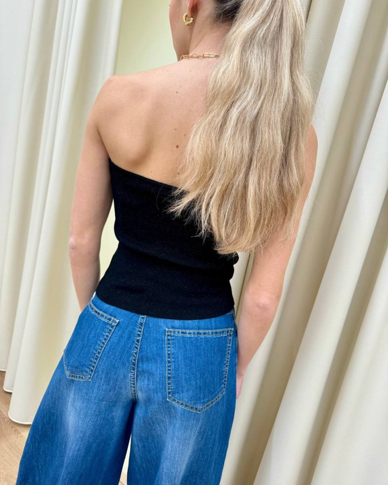 Top in maglia a costine nero con lurex in tono, modello a fascia con scollo a cuore. Vestibilità aderente elasticizzata.