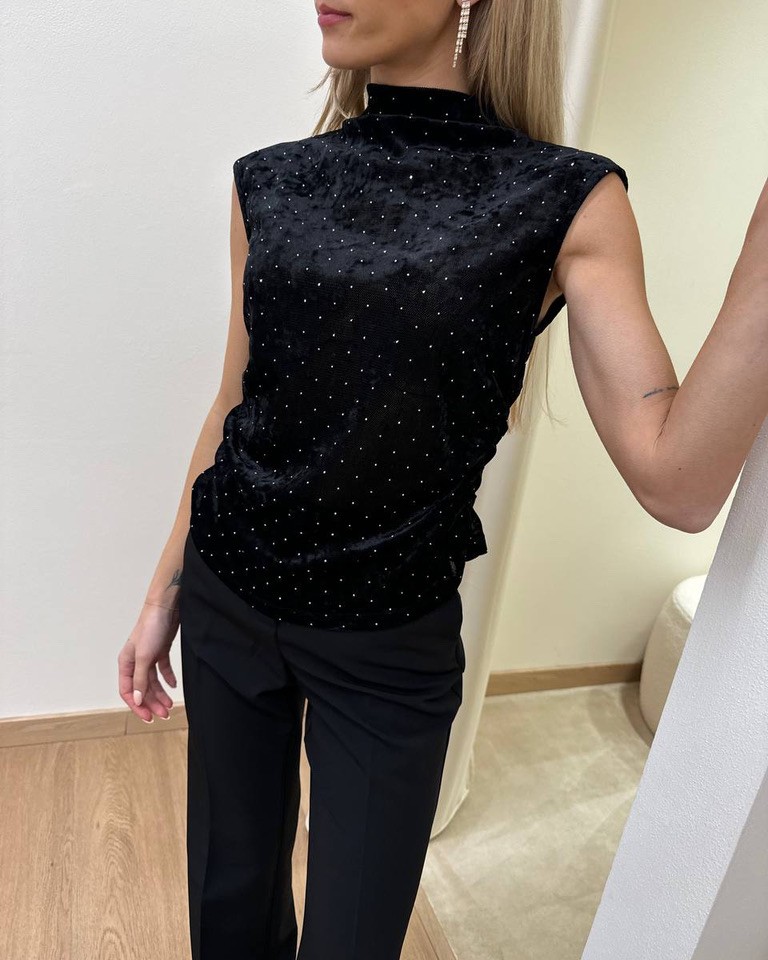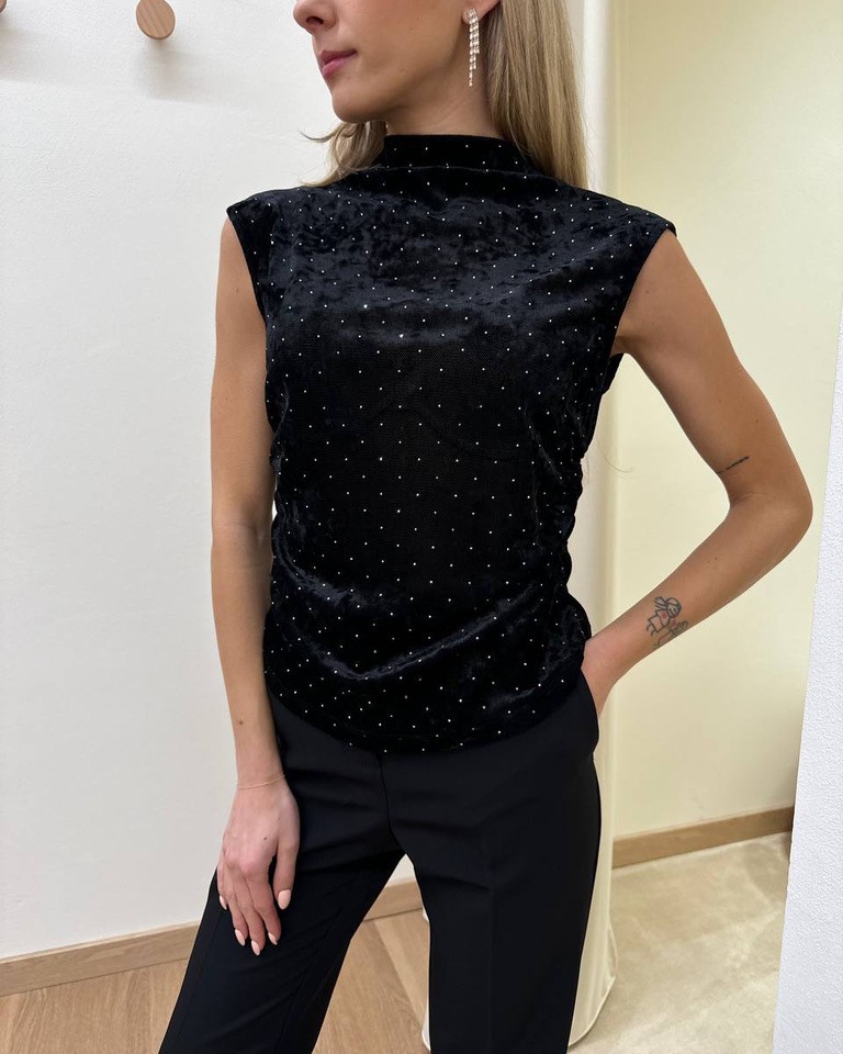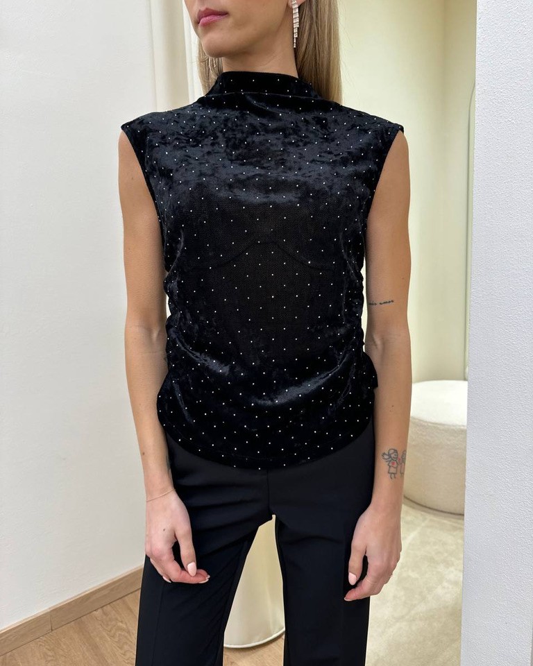Top in velluto nero con strass, modello smanicato con collo vulcano e drappeggi sui fianchi. Vestibilità aderente elasticizzata.