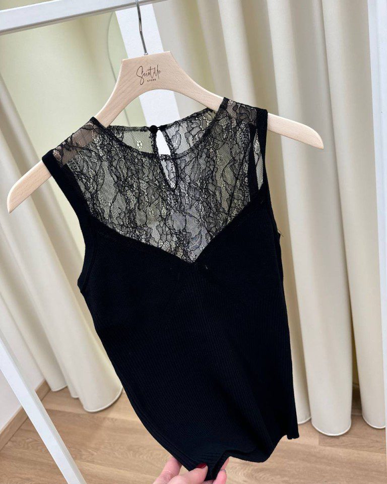 Top in maglia a costine nero con viscosa con dettaglio in pizzo sulla parte superiore, modello girocollo smanicato. Vestibilità aderente ed elasticizzata.
