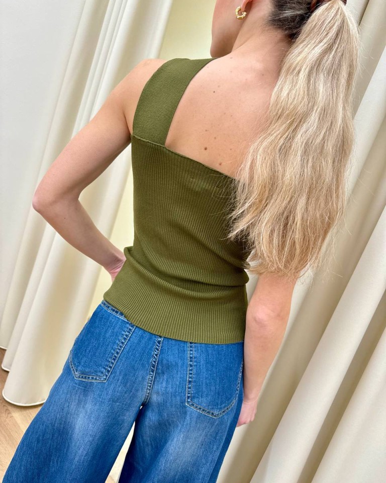 Top in maglia a costine olio, modello dritto con scollo incrociato davanti e dettaglio gioiello oro. Vestibilità aderente ed elasticizzata.