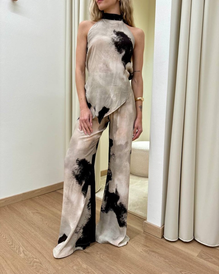 Top in fantasia astratta sabbia e moro, modello a fazzoletto con scollo all’americana con allacciatura al collo, schiena scoperta con fiocchi. Vestibilità regolare.