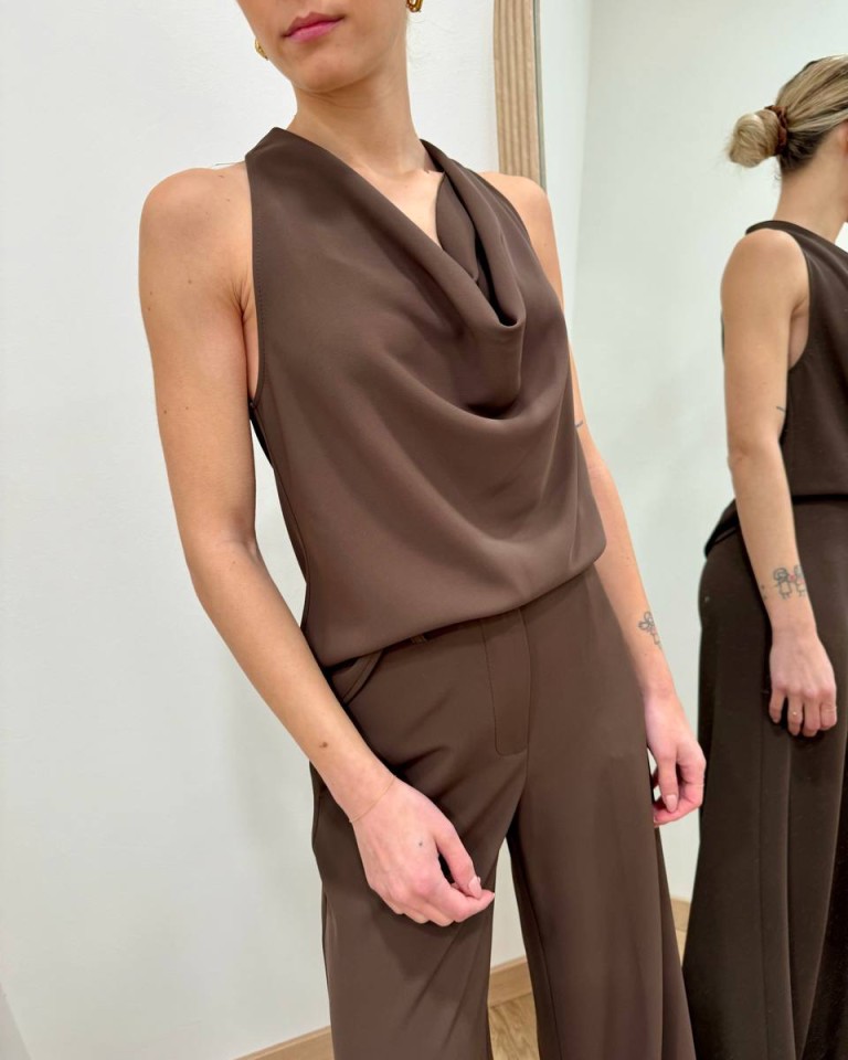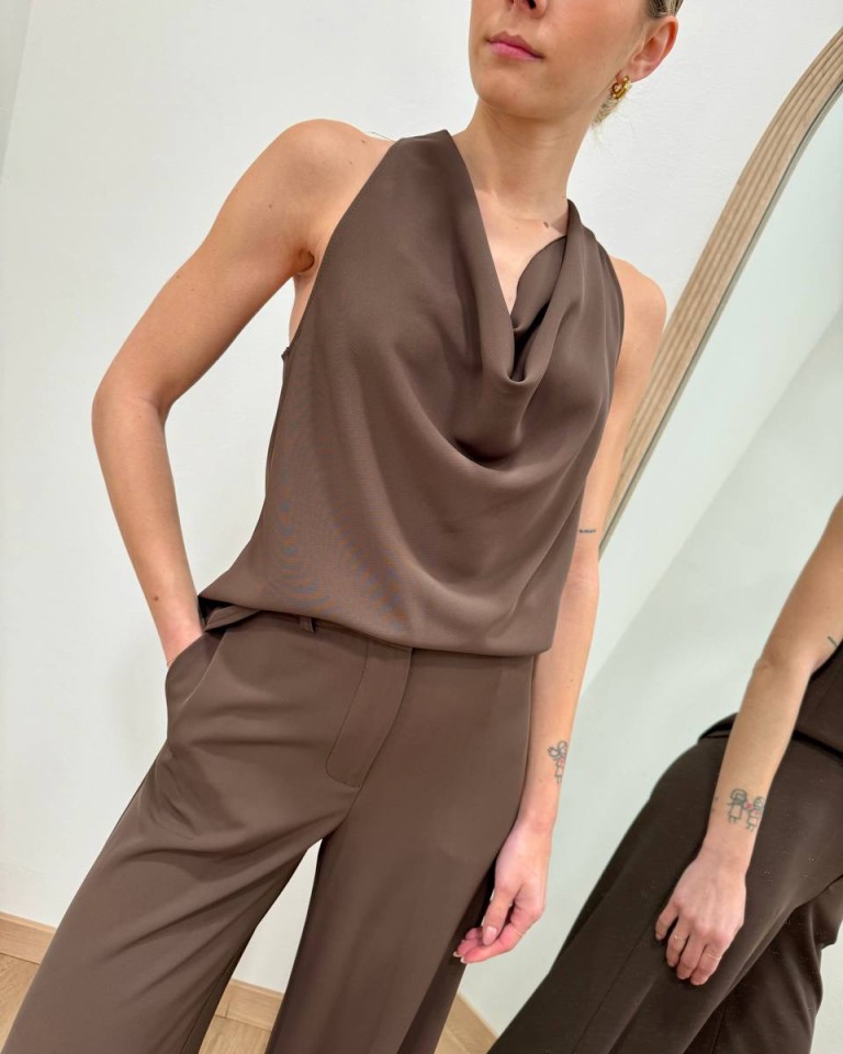 Top color moro, modello leggermente svasato con scollo a gronda e allacciatura al collo con bottoni. Vestibilità regolare.