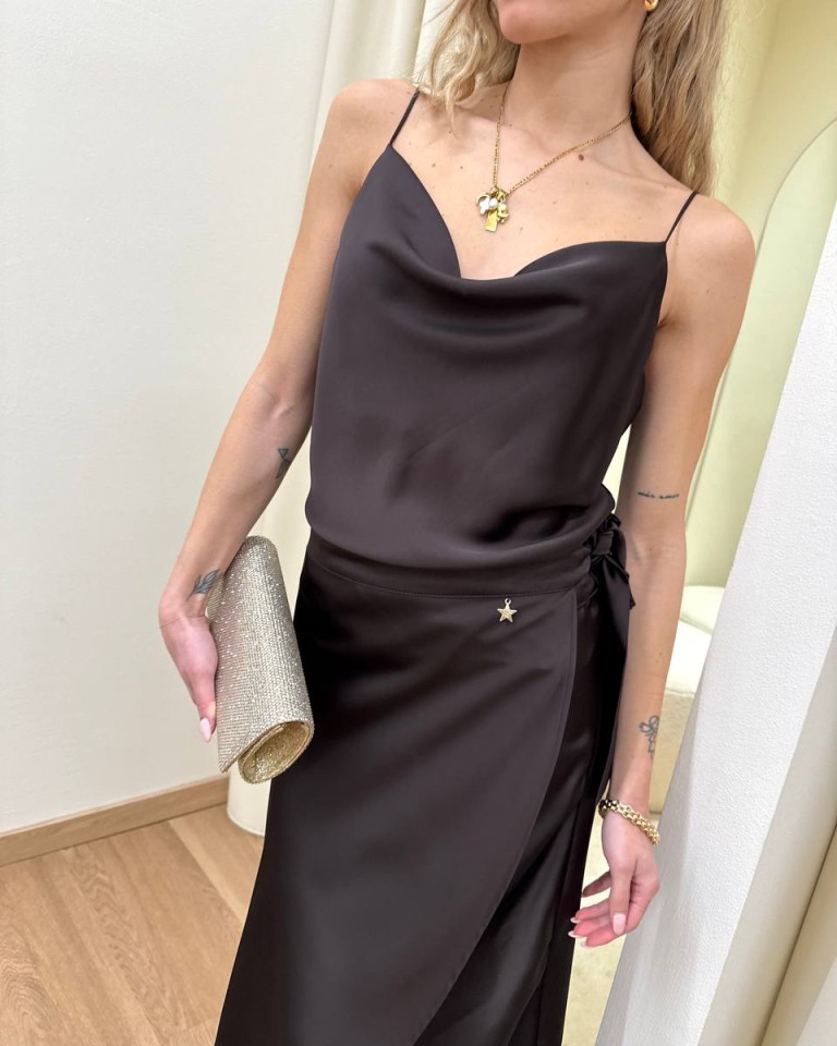 Top in raso color moro, modello dritto con scollo a gronda e spalline sottili. Vestibilità regolare.