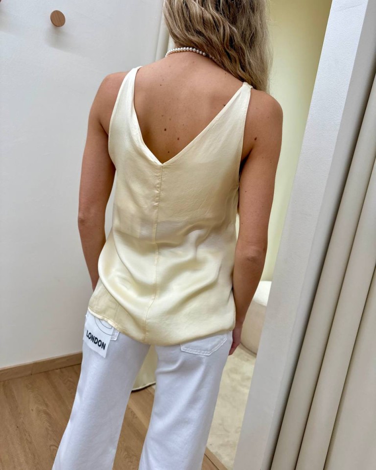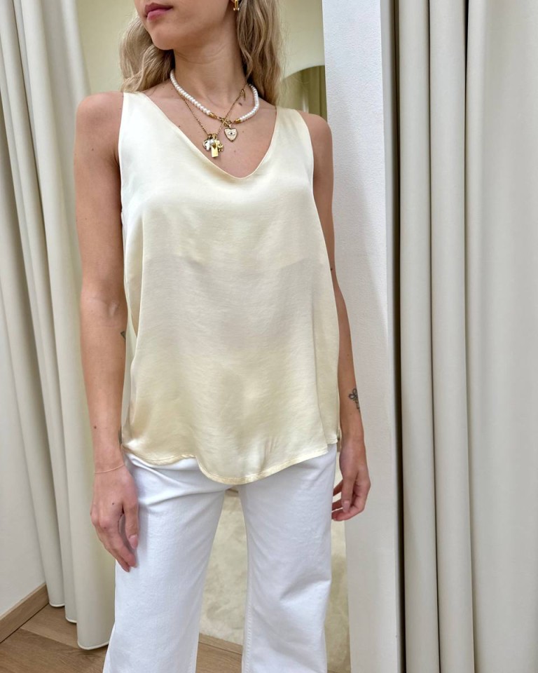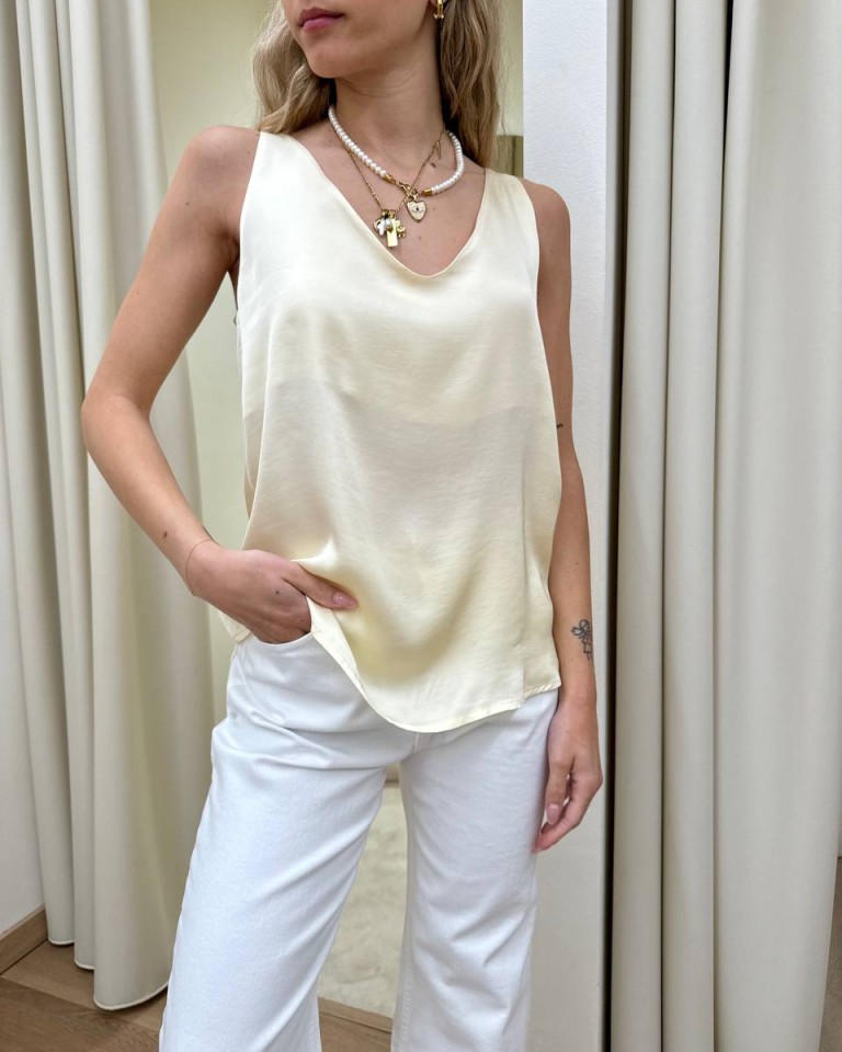 Top in raso di viscosa color burro, modello a canotta svasata con scollo a v e spalline. Vestibilità regolare.