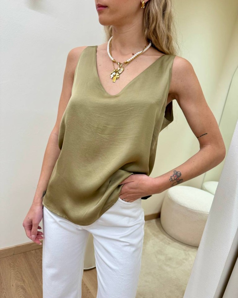 Top in raso di viscosa color verde oliva, modello a canotta svasata con scollo a v e spalline. Vestibilità regolare.