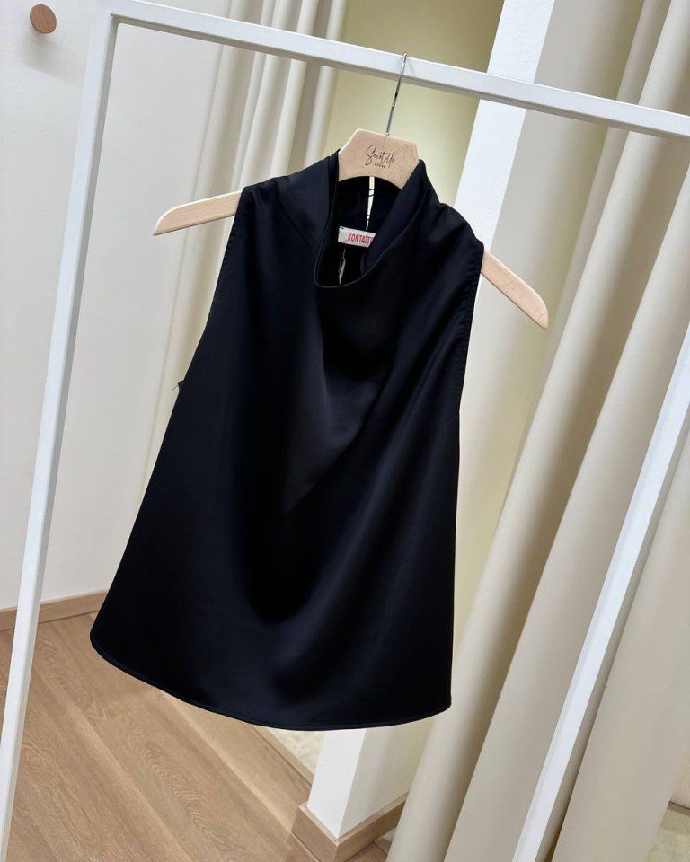 Top in raso di viscosa nero, modello smanicato con scollo ad anello con chiusura sul dietro con bottoni. Vestibilità dritta e regolare.