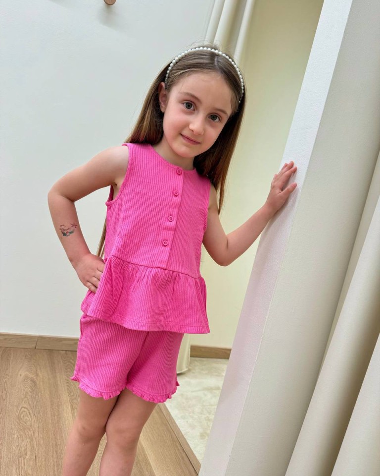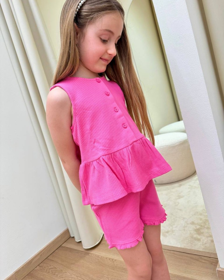Top in spugna a nido d’ape color fucsia, modello smanicato a girocollo con bottoncini davanti e balza con arricciatura in vita. Vestibilità regolare.