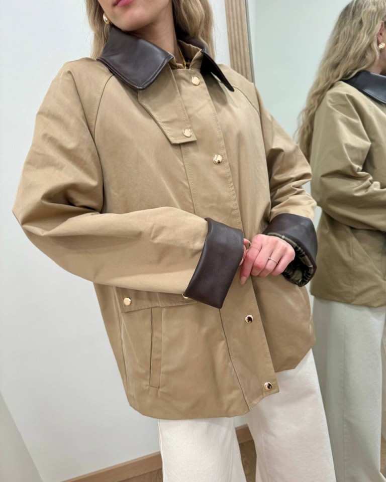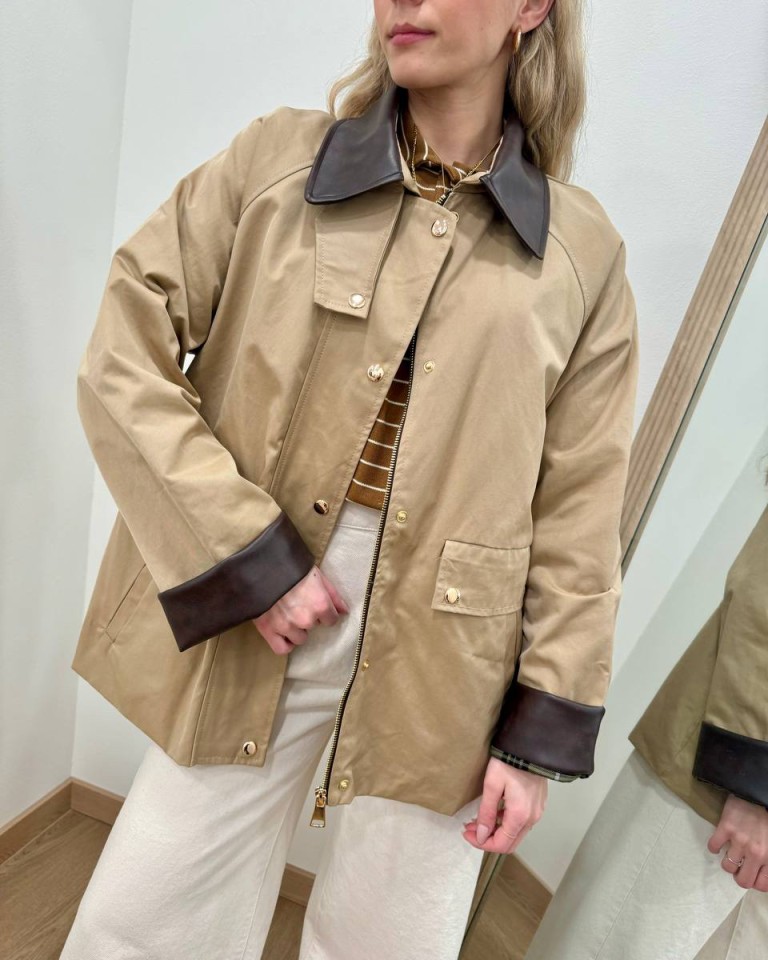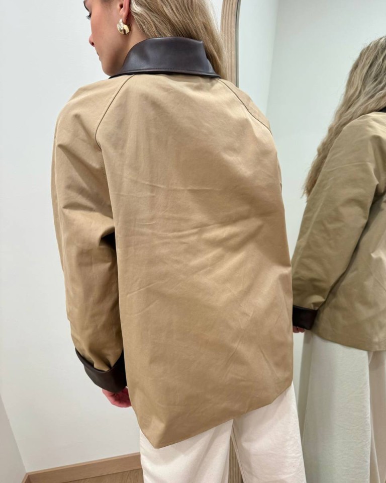 Trench color beige. Modello oversize dritto corto, maniche raglan lunghe, colletto classico e rovescia polsi in ecopelle moro, tasche davanti oblique. Chiusura davanti con zip e bottoni automatici. Foderato. Vestibilità ampia.