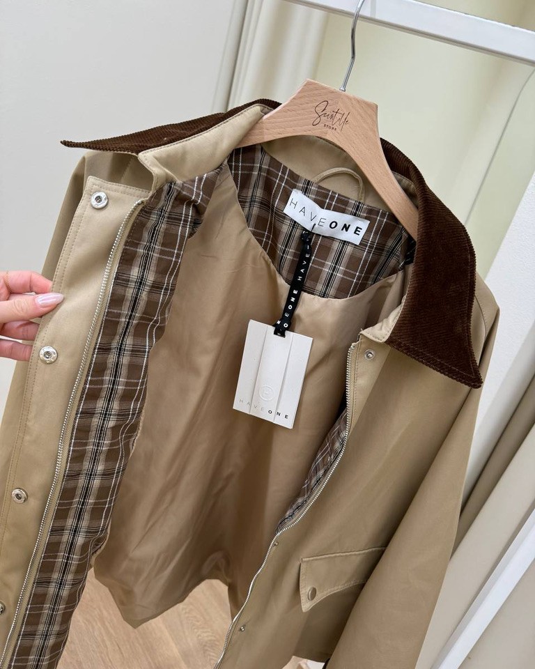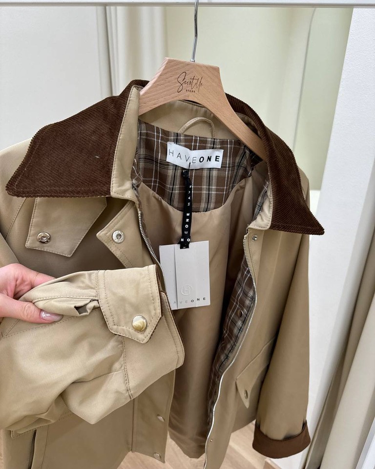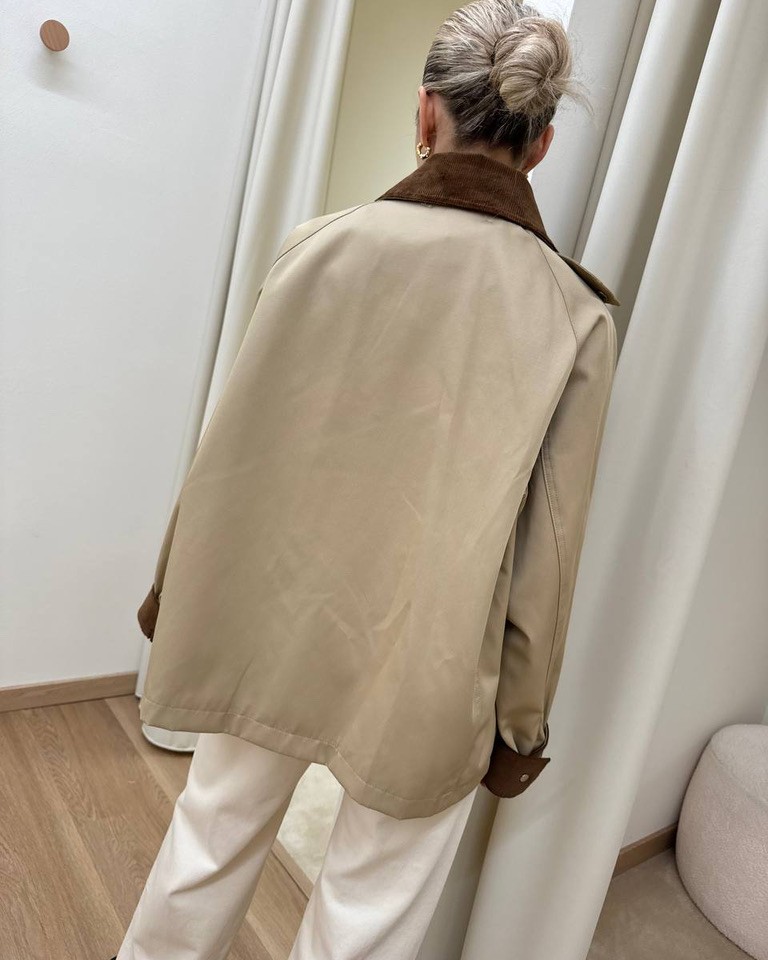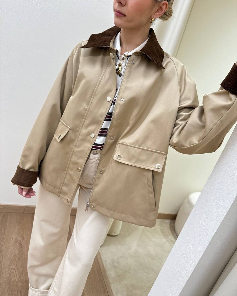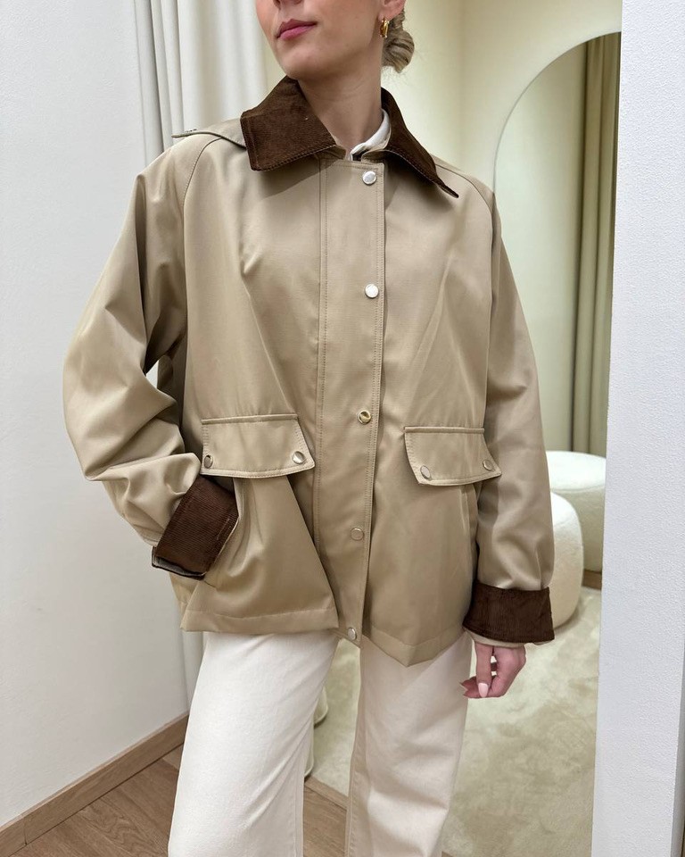 Trench color cammello. Modello oversize dritto corto, maniche raglan lunghe, colletto classico e rovescia polsi in velluto moro a costine, tasche davanti oblique. Chiusura davanti con zip e bottoni automatici. Foderato. Vestibilità ampia.