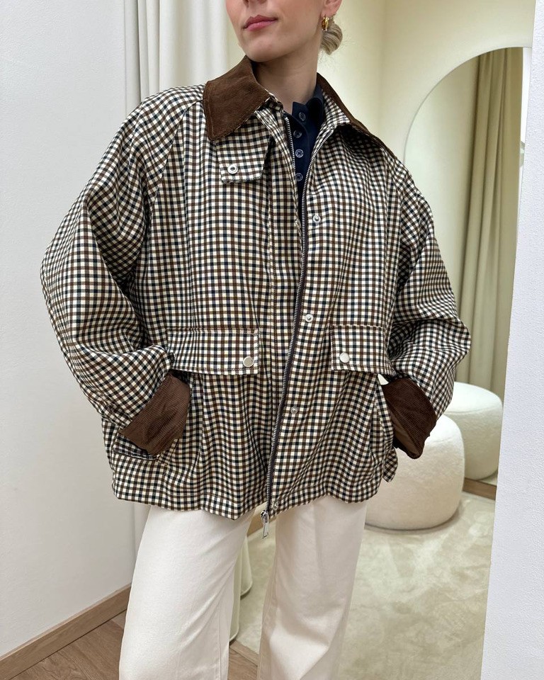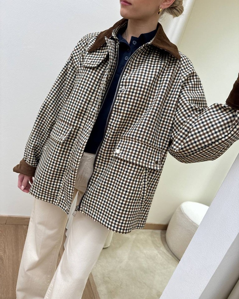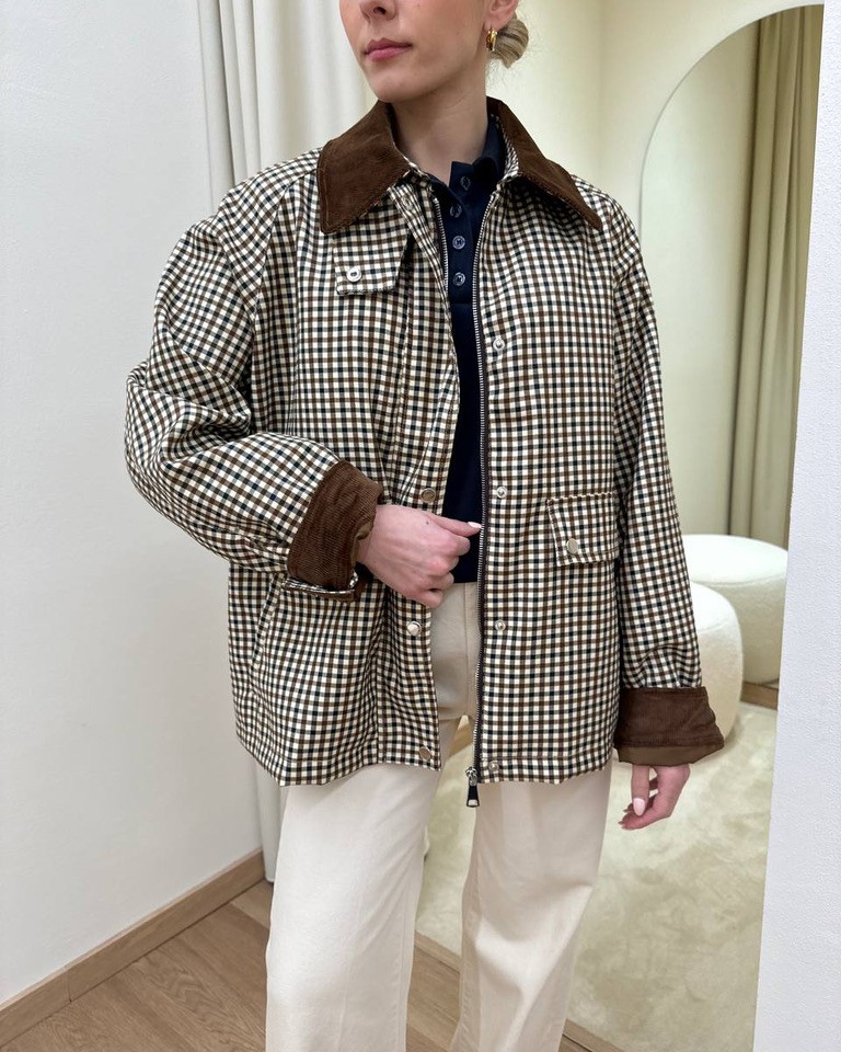 Trench a quadretti burro, nero e moro. Modello oversize dritto corto, maniche raglan lunghe, colletto classico e rovescia polsi in velluto moro a costine, tasche davanti oblique. Chiusura davanti con zip e bottoni automatici. Foderato. Vestibilità ampia.