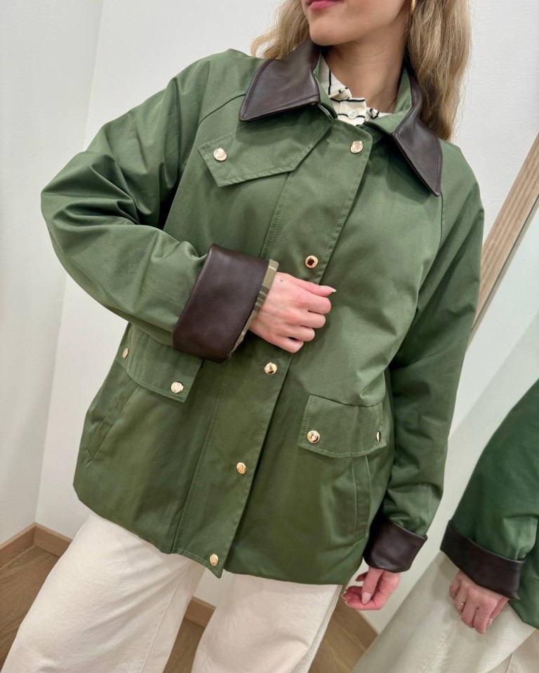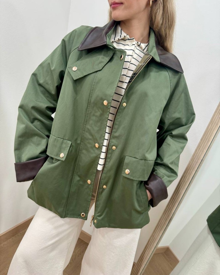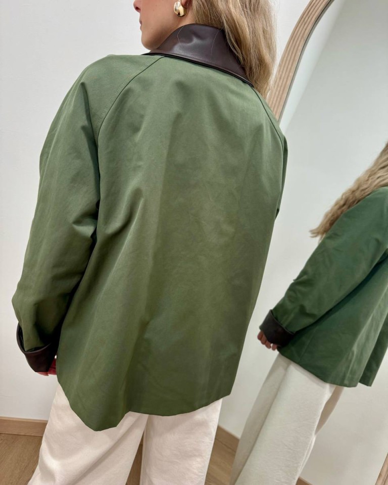 Trench color verde militare. Modello oversize dritto corto, maniche raglan lunghe, colletto classico e rovescia polsi in ecopelle moro, tasche davanti oblique. Chiusura davanti con zip e bottoni automatici. Foderato. Vestibilità ampia.