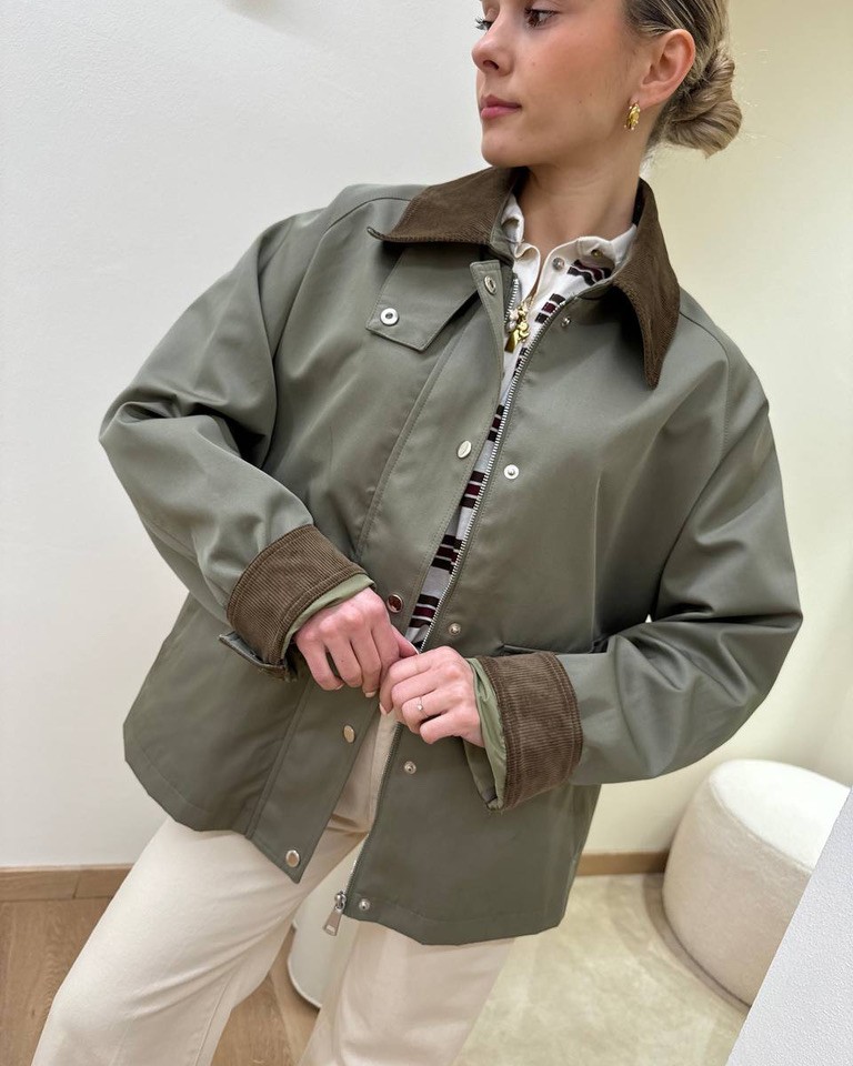 Trench color verde militare. Modello oversize dritto corto, maniche raglan lunghe, colletto classico e rovescia polsi in velluto moro a costine, tasche davanti oblique. Chiusura davanti con zip e bottoni automatici. Foderato. Vestibilità ampia.