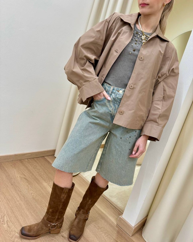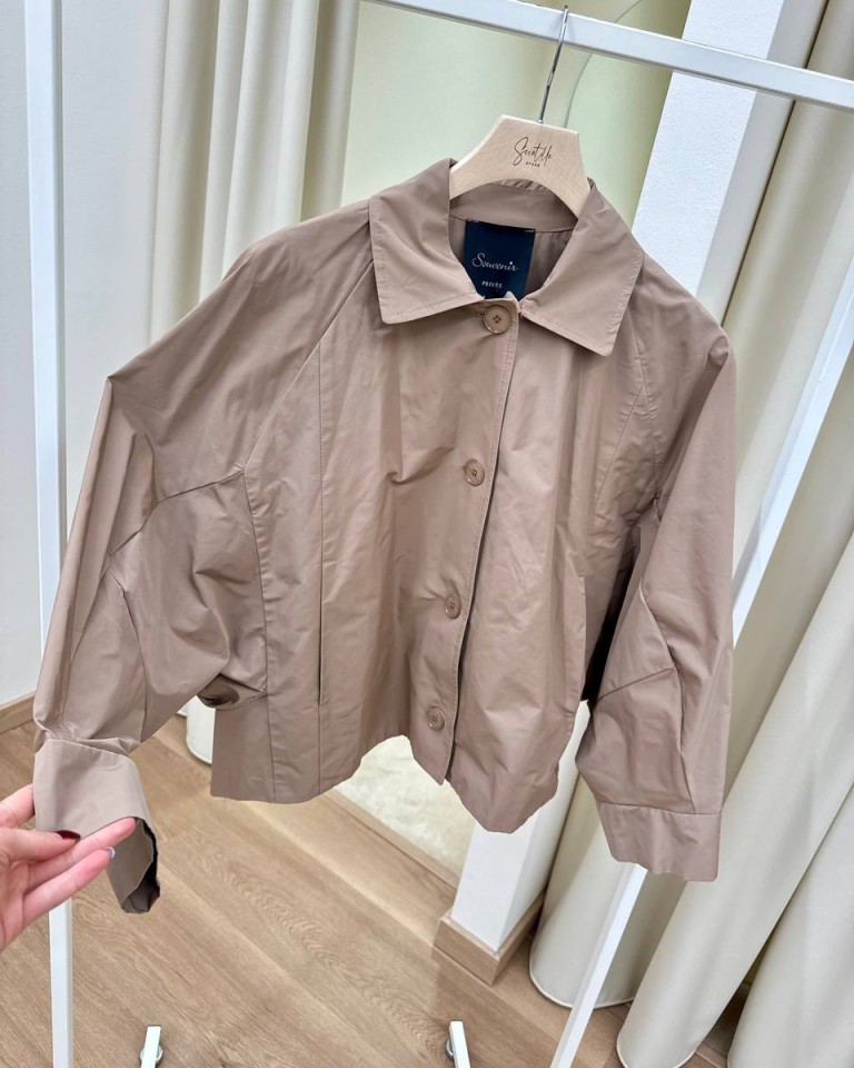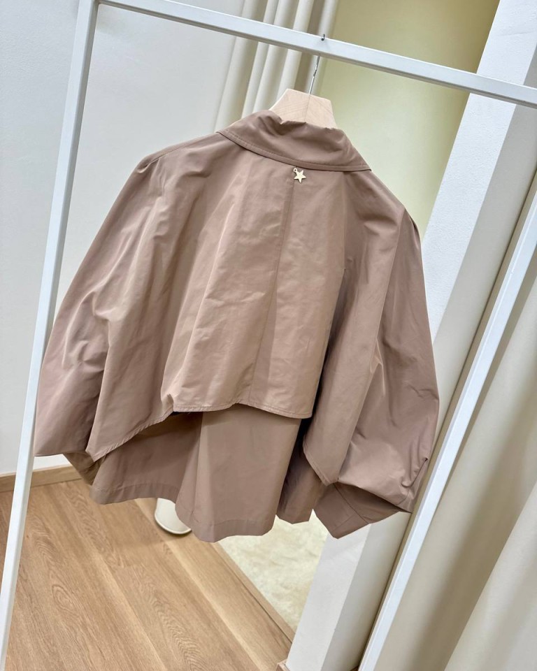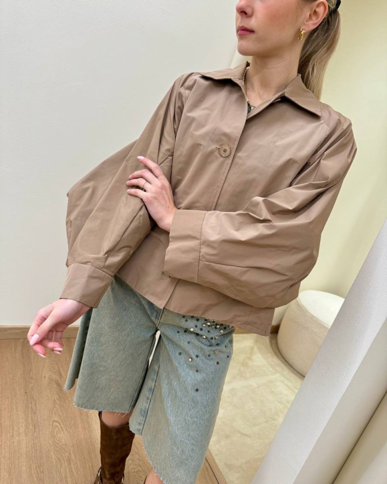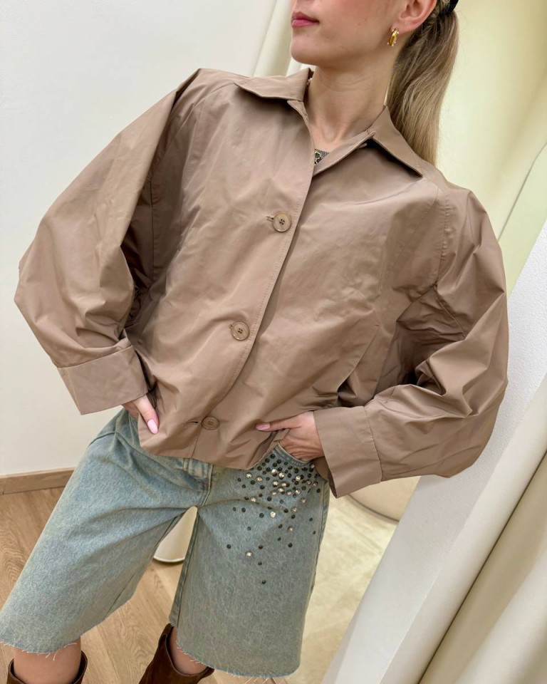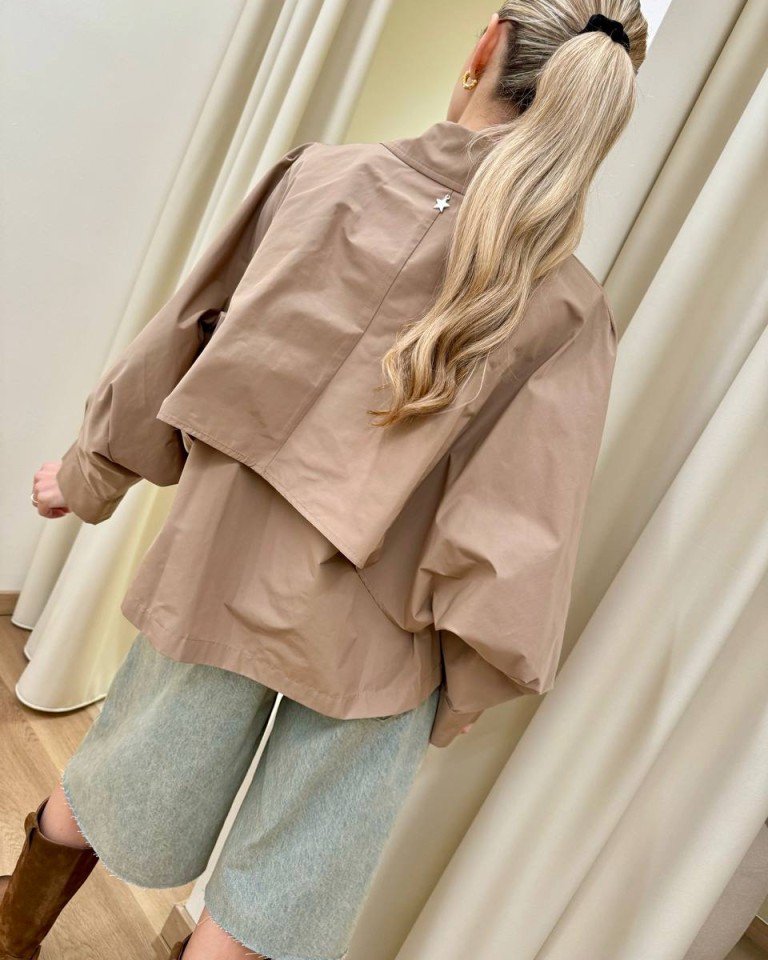 Trench color nocciola, modello over corto, colletto classico, manica raglan a pipistrello, tasche laterali, mantellina dietro, chiusura con bottoni davanti. Vestibilità ampia.