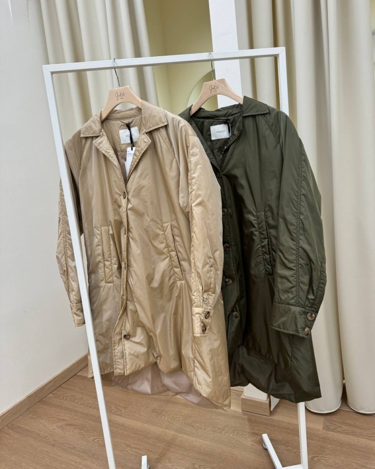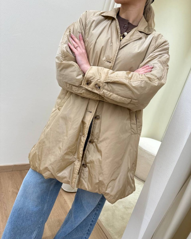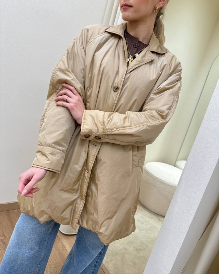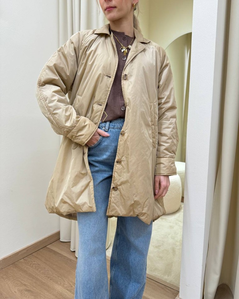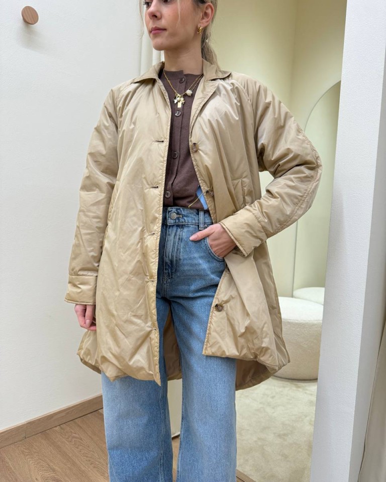 Trench imbottito beige. Modello oversize svasato, maniche raglan lunghe, rever classico, tasche oblique, davanti più corto del dietro. Chiusura con bottoni. Vestibilità ampia.