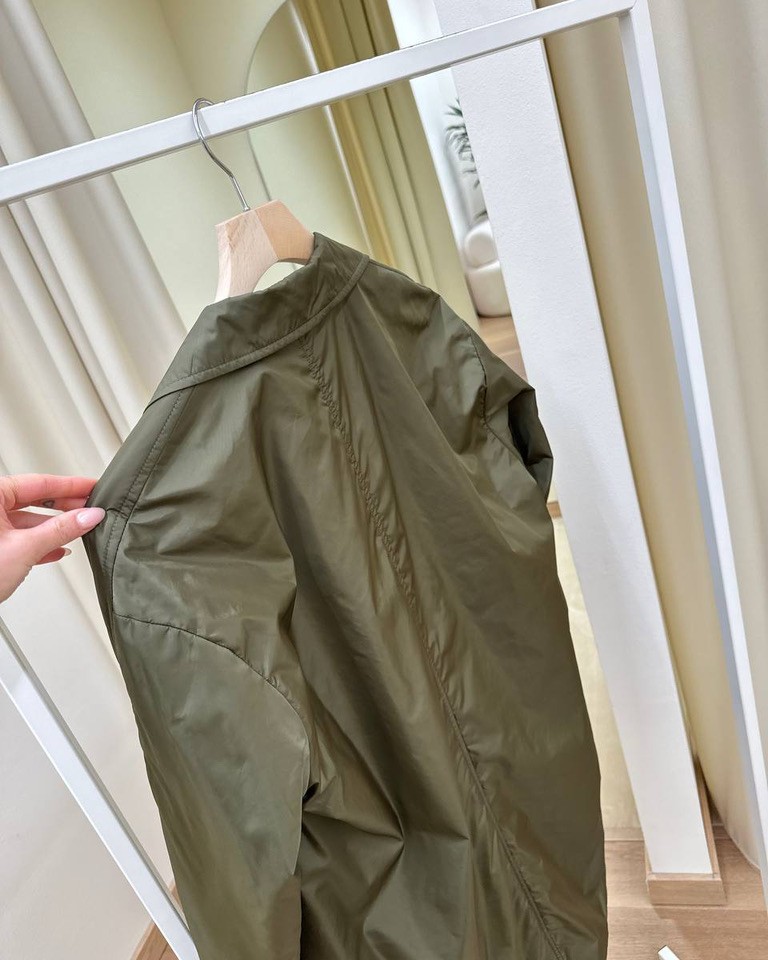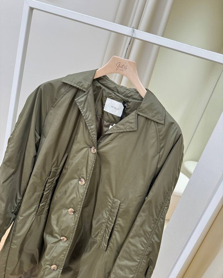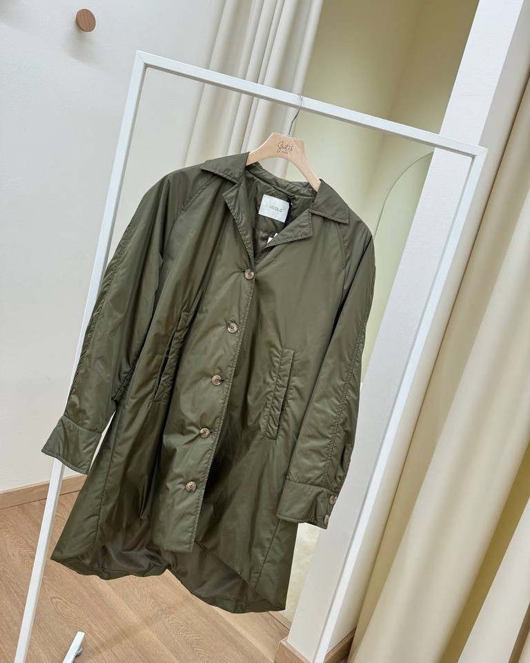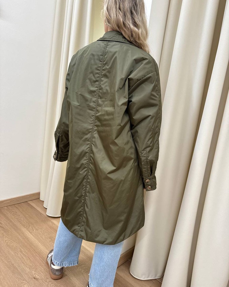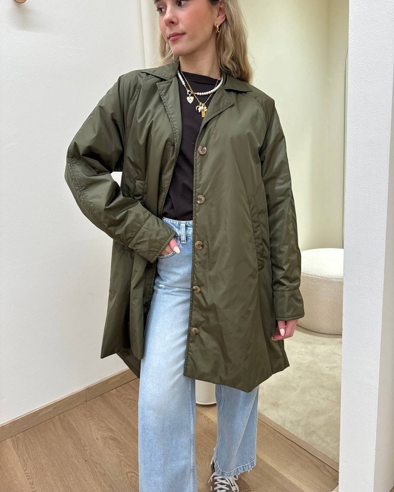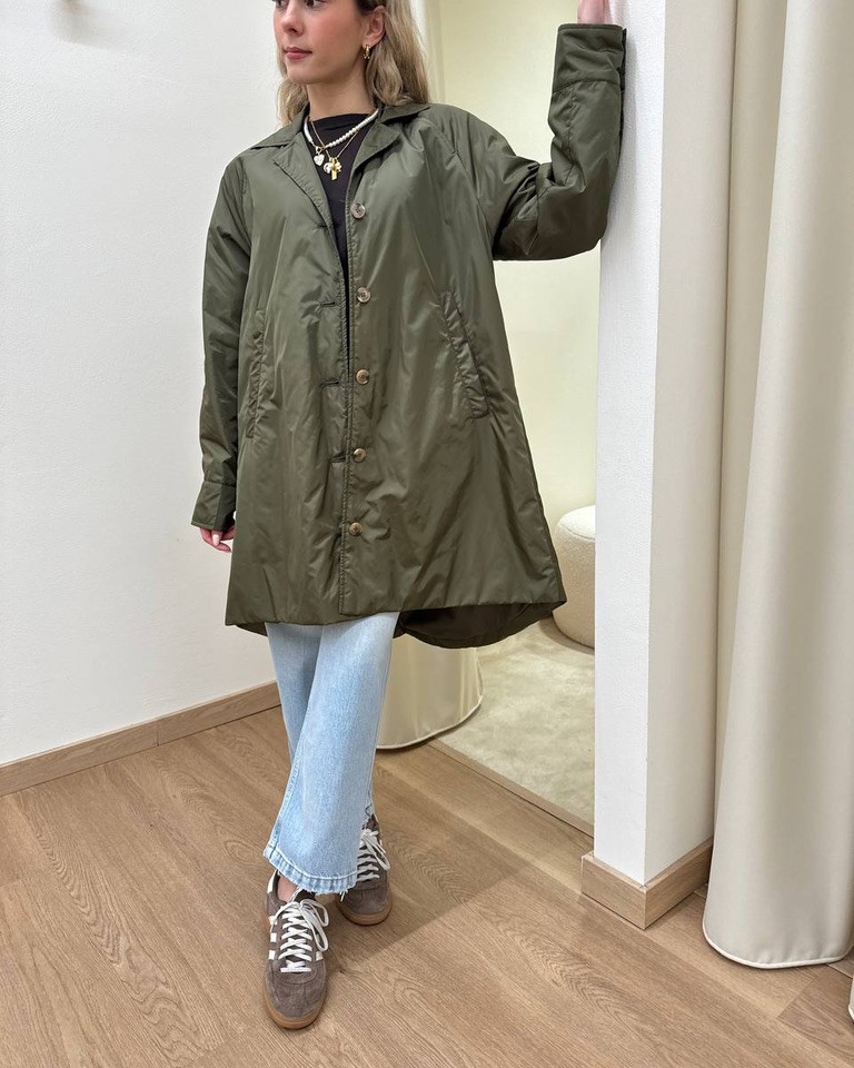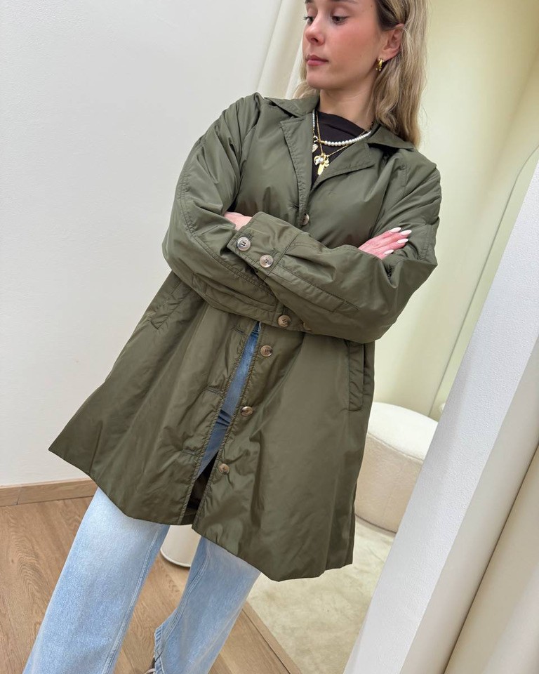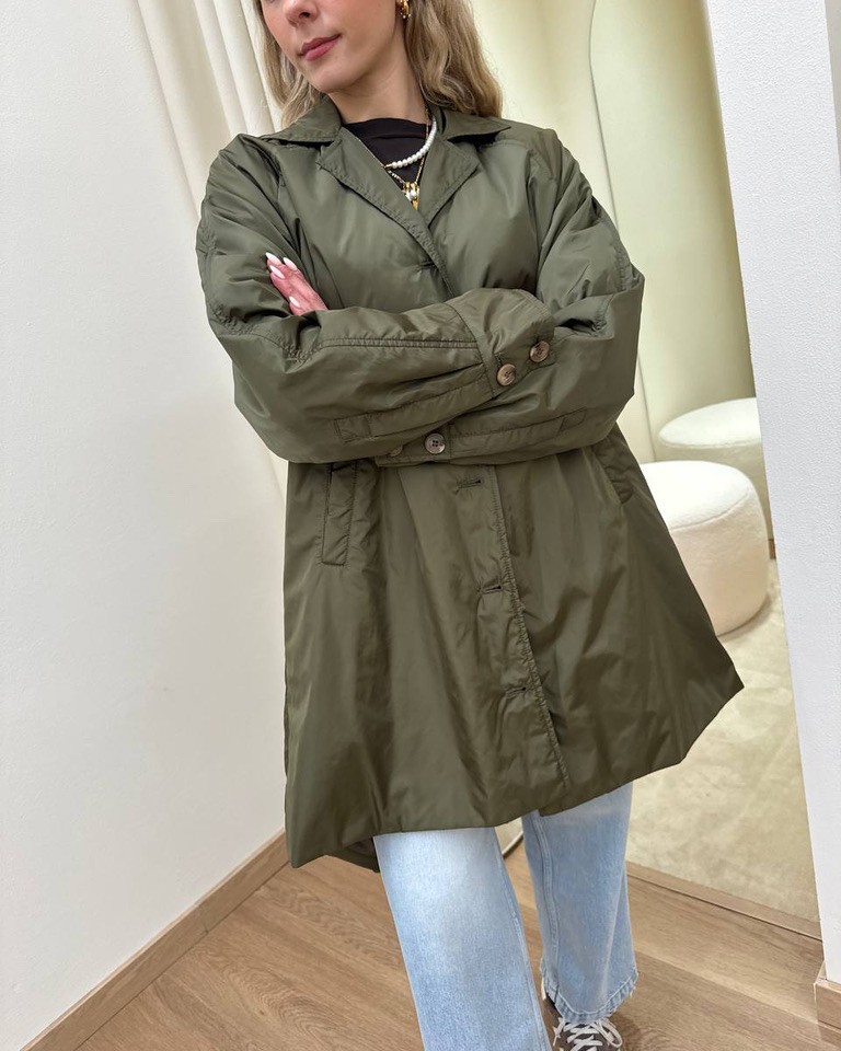 Trench imbottito verde militare. Modello oversize dritto, maniche raglan lunghe, rever classico, tasche oblique, davanti più corto del dietro. Chiusura con bottoni. Vestibilità ampia.