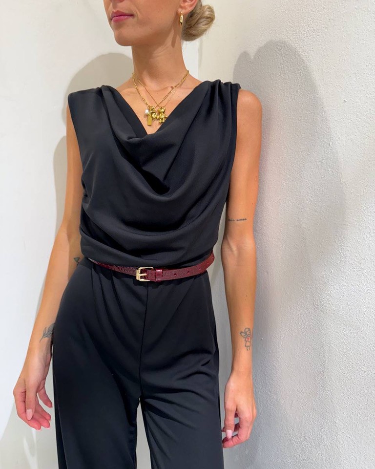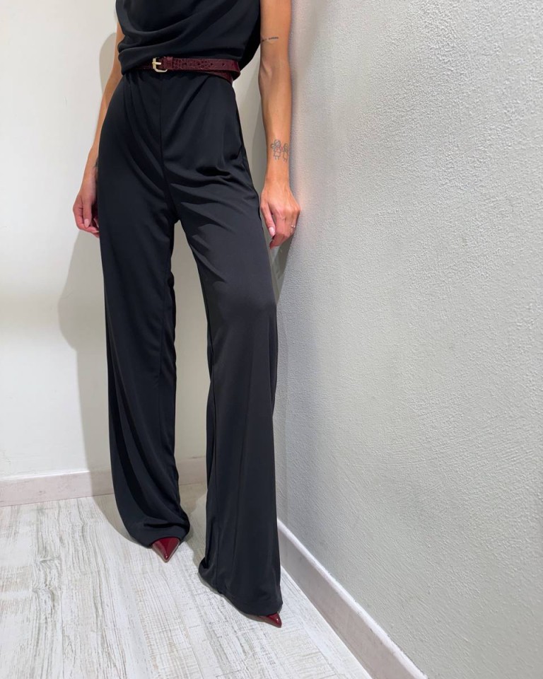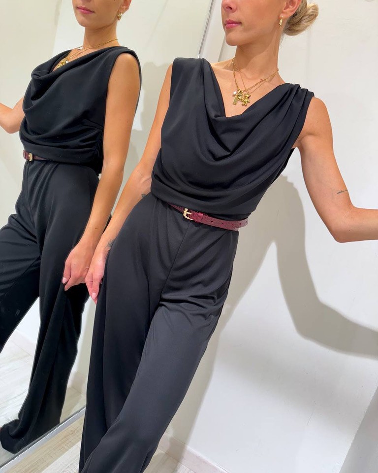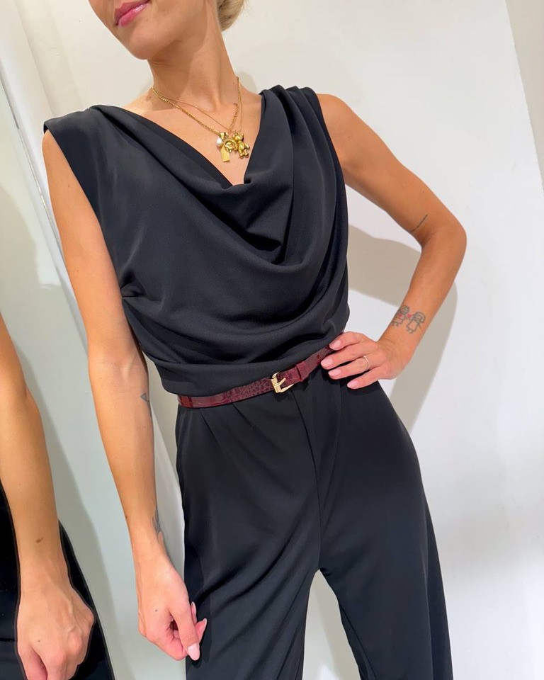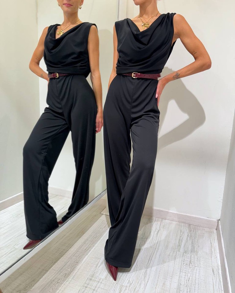 Tuta nera in tessuto elasticizzato, modello lungo, pantalone palazzo, smanicata con scollo a gronda e schiena scoperta. Vestibilità elasticizzata.