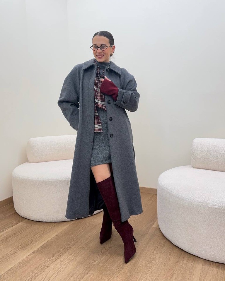 Un look raffinato dal gusto contemporaneo, perfetto per la città. Il cappotto lungo grigio dal taglio sartoriale avvolge un mix di texture calde: mini skirt in lana, camicia a quadri e maglia a collo alto layered. Gli stivali al ginocchio color bordeaux slanciano la figura e aggiungono un tocco deciso e femminile. Un outfit sofisticato ma portabile, ideale per le giornate fredde con stile.