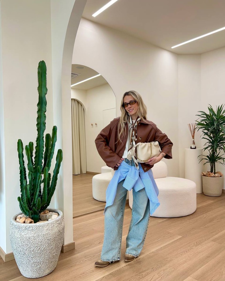 Il pezzo protagonista è il bomber corto in ecopelle color mattone effetto intrecciato, che rende l’outfit più strutturato. In vita è annodata una camicia azzurra, utilizzata come layering stilistico per dare profondità e un vibe street style.