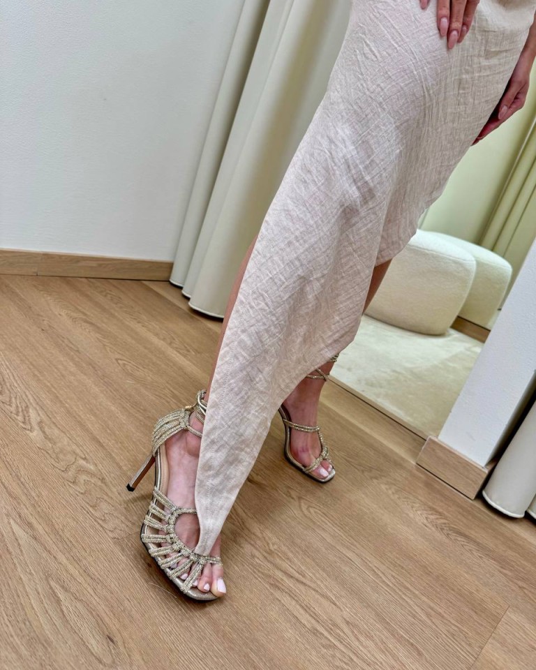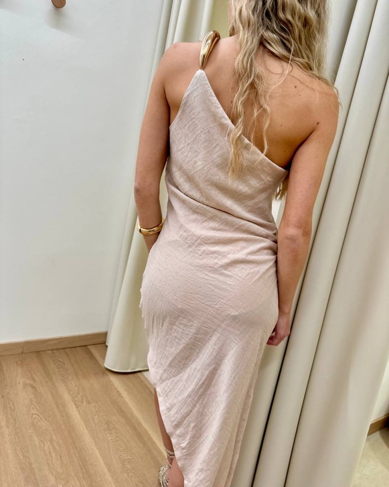 Vestito color sabbia, modello asimmetrico monospalla con spallino gioiello, arricciatura sul fianco e spacco laterale, chiusura con zip sul fianco. Vestibilità regolare.