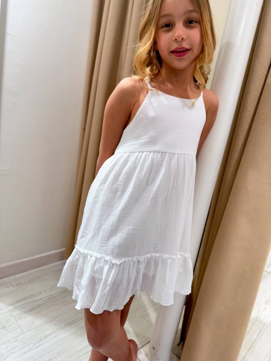 Vestito bianco con pizzo, modello scollo rotondo con spalline sottili, taglio in vita con balza sulla gonna, elastico sul dietro con foro e chiusura com bottoncino.Vestibilità regolare.