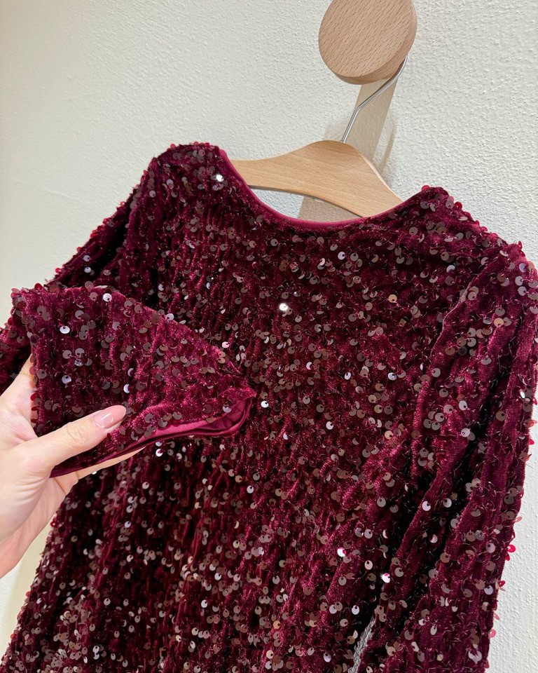 Vestito bordeaux ricoperto da paillettes con dettaglio fiocco nero sul dietro, modello corto, girocollo, maniche lunghe svasate sul fondo. Vestibilità regolare. Foderato all’interno.