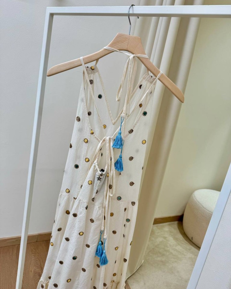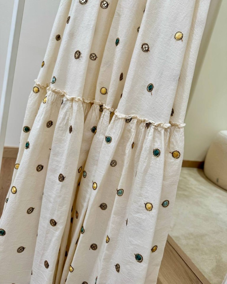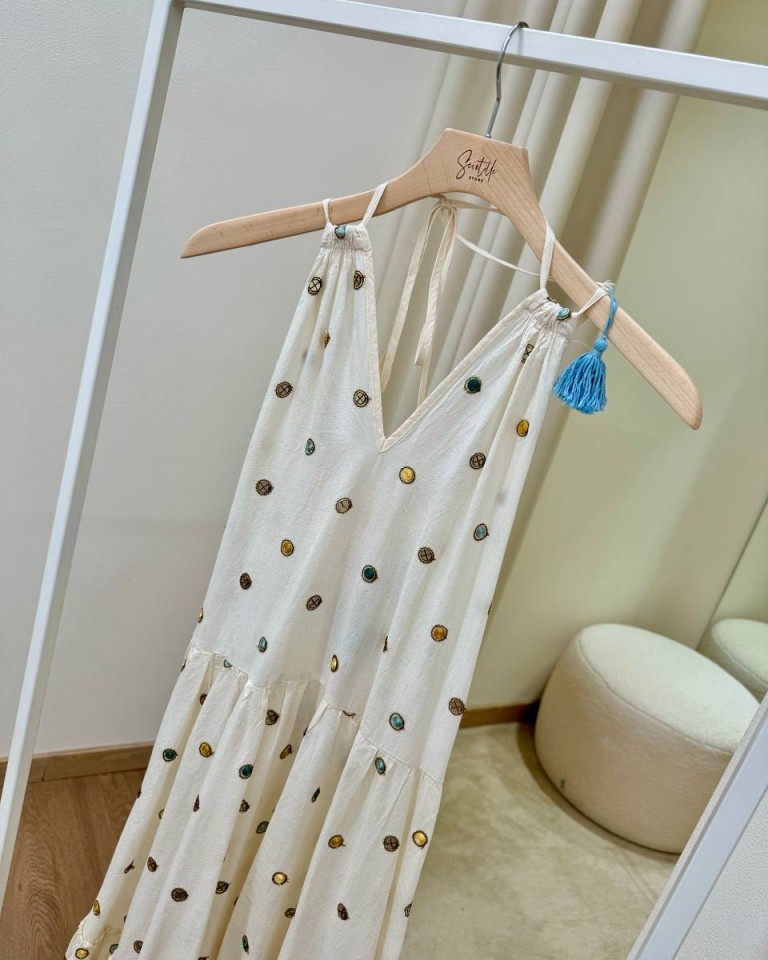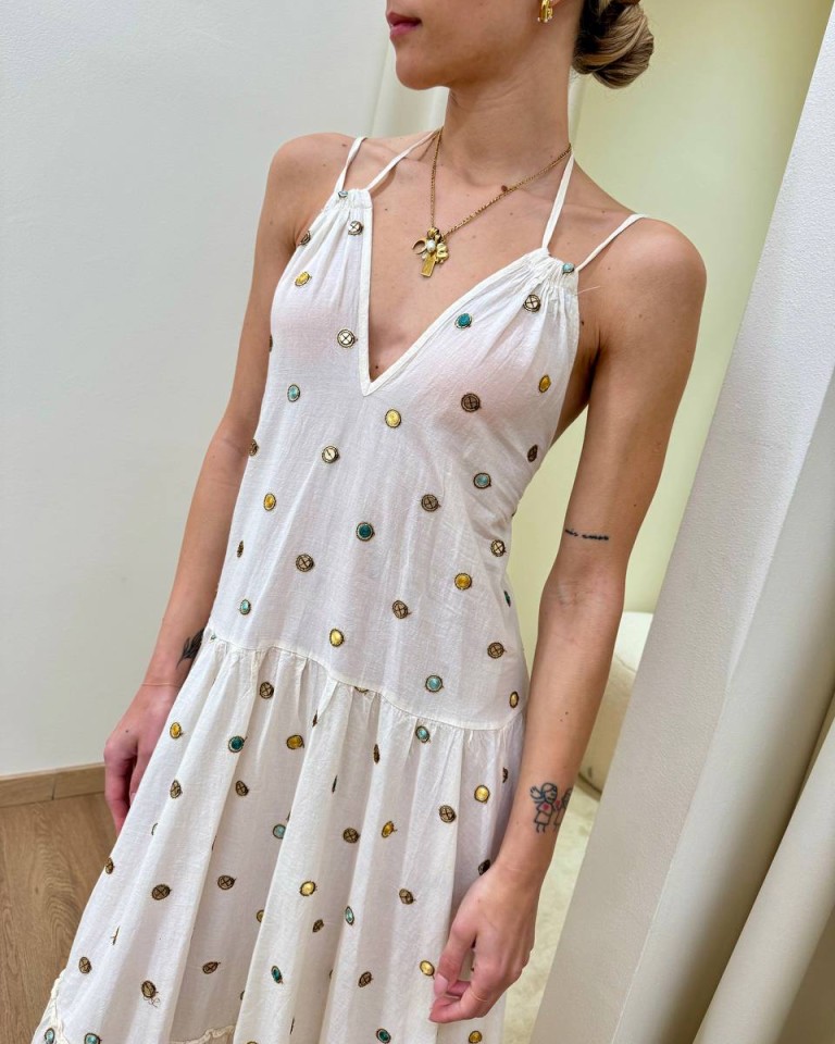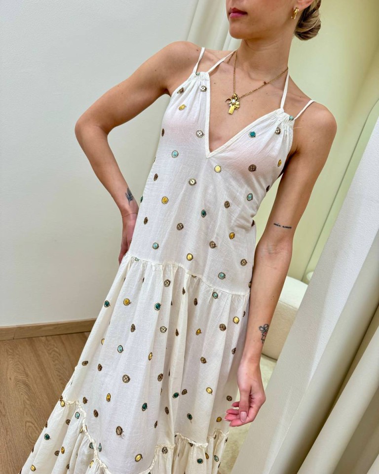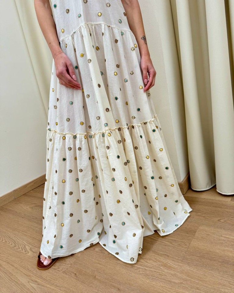Vestito in cotone burro con ricami e paillettes multicolor, modello ampio con scollo a V, gonna svasata con balze, schiena scoperta con allacciatura intrecciata. Vestibilità ampia.