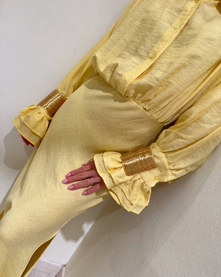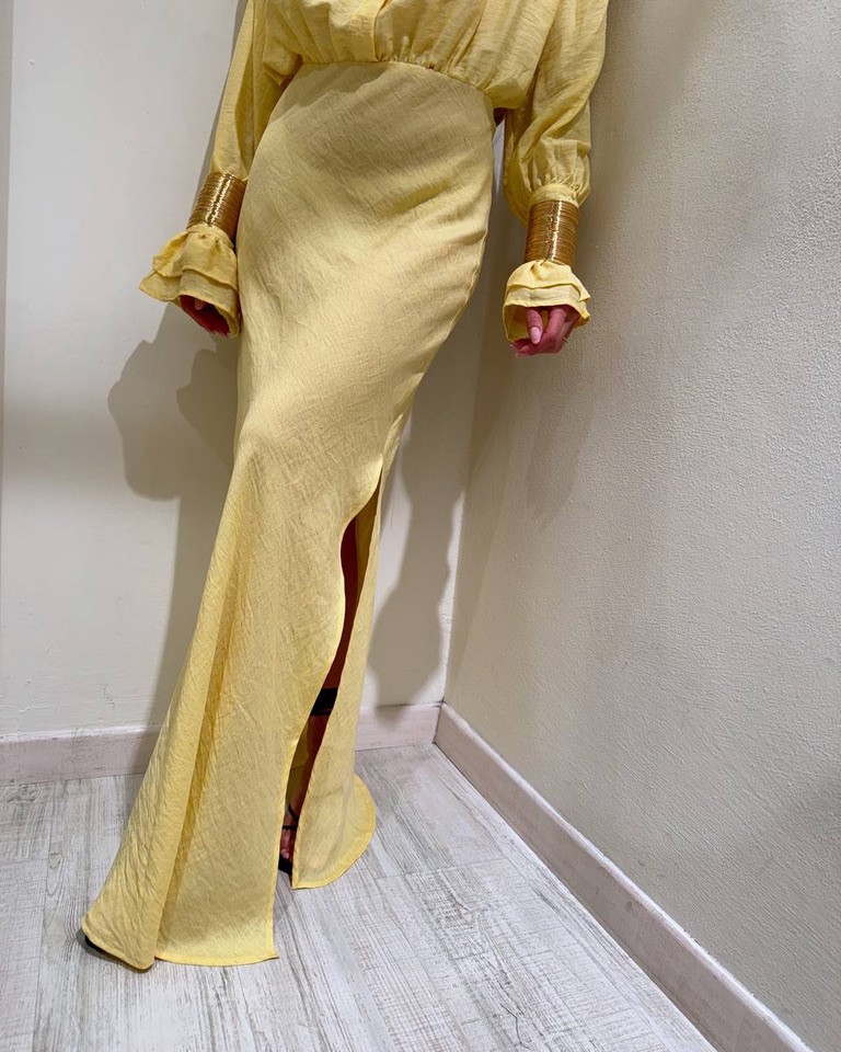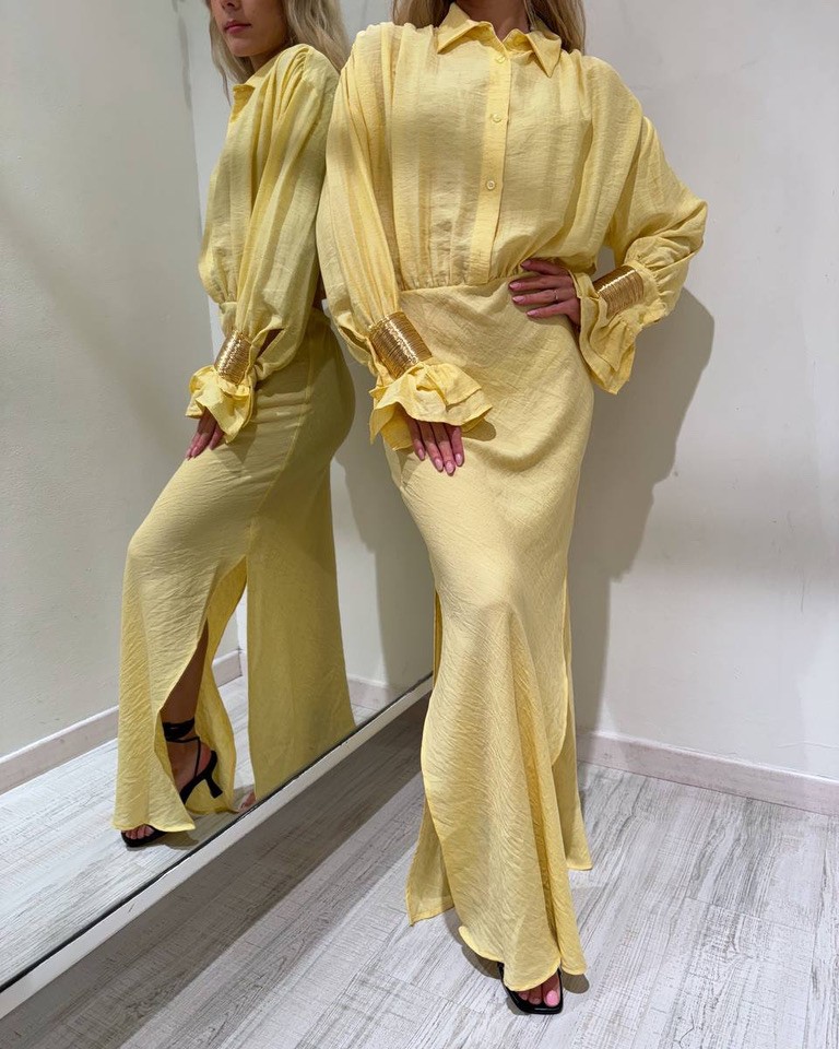 Vestito color giallo pastello con viscosa e lino, modello camicia lungo, maniche lunghe con polsino, gale e bracciali oro rimovibili, colletto e chiusura frontale con bottoni. Gonna lunga con spacchi laterali. Dietro con cut out in vita. Vestibilità ampia.