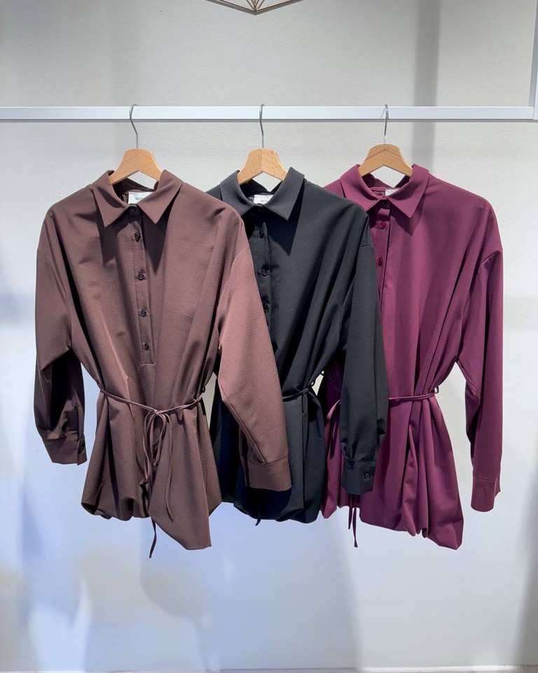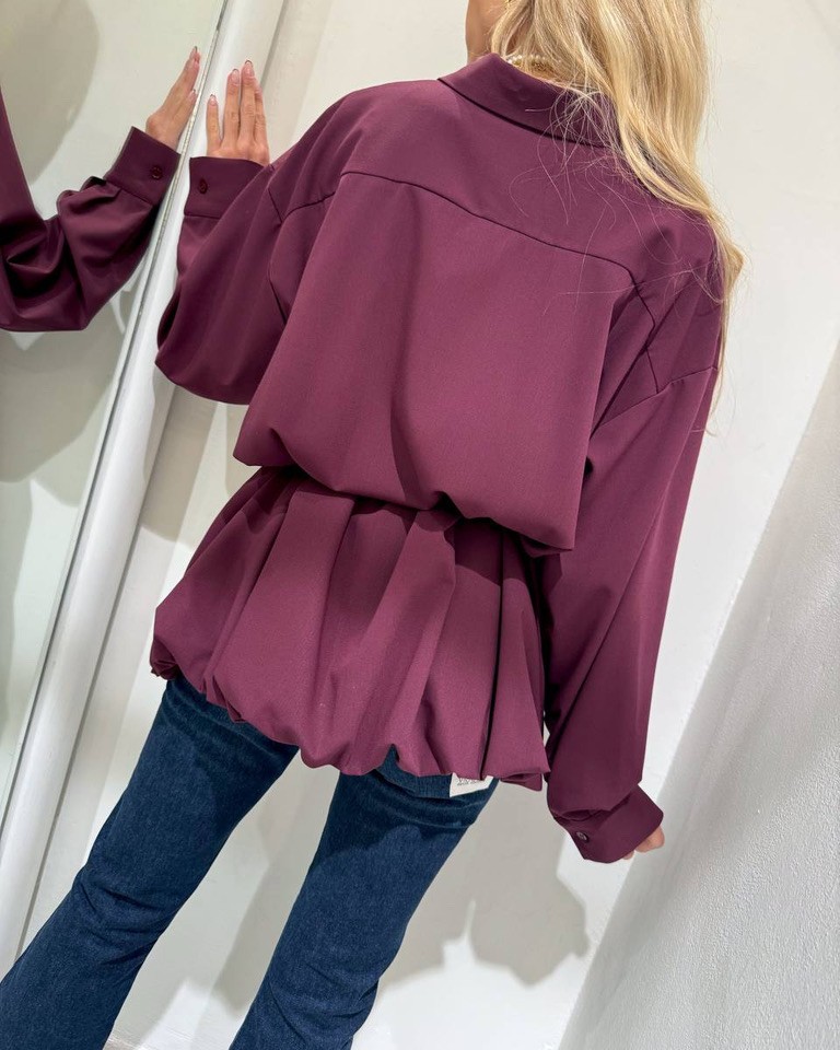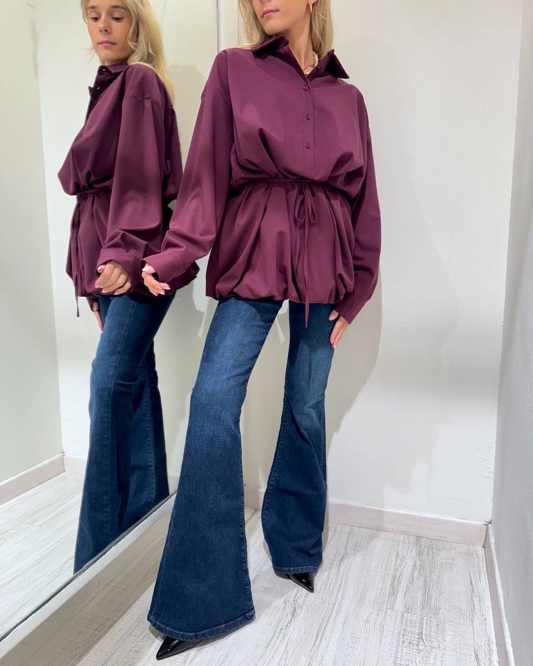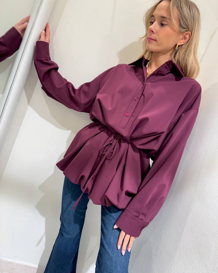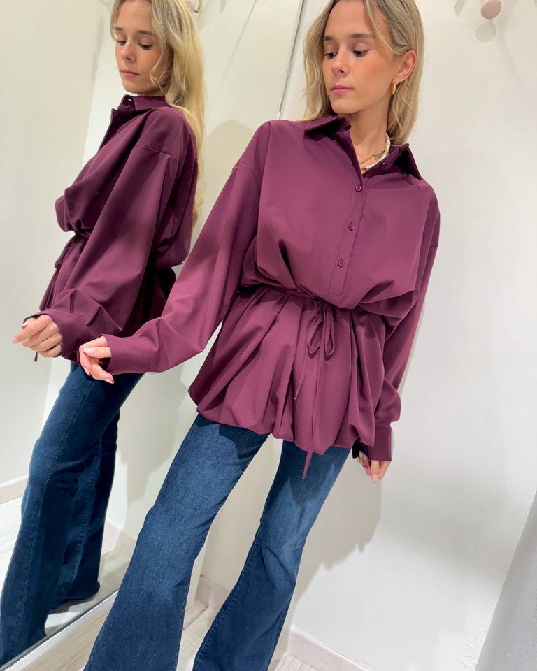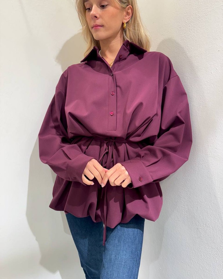 Vestito color vino con viscosa e lana, modello camicia corto maniche lunghe, colletto e chiusura frontale con bottoni. Gonna a palloncino con elastico sul fondo e laccio in vita. Vestibilità ampia.