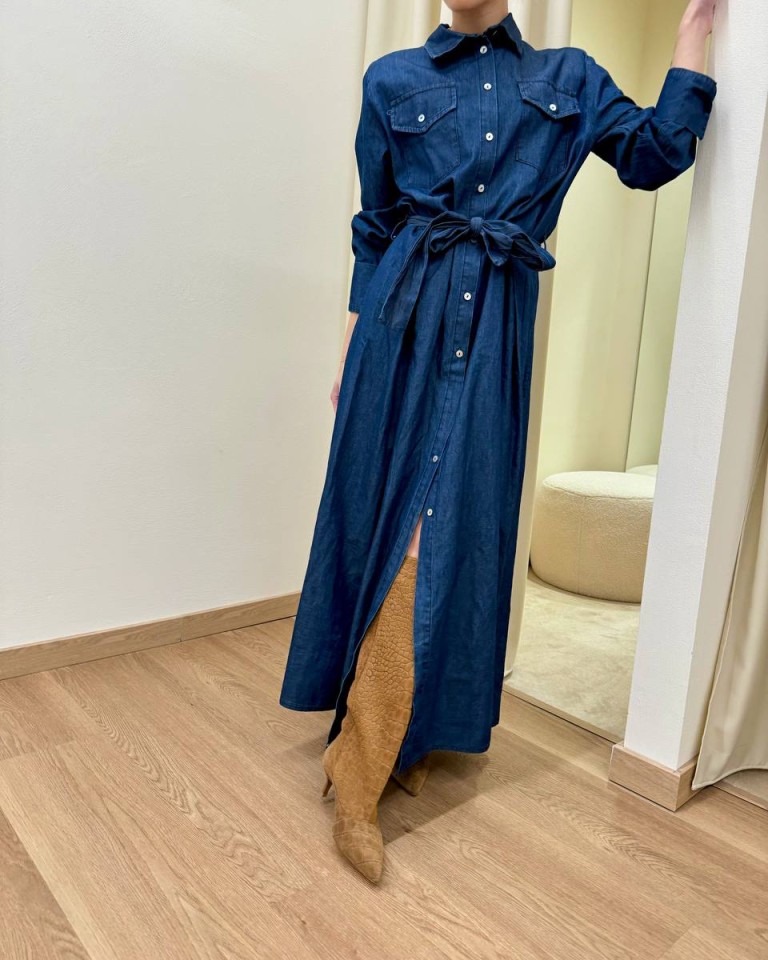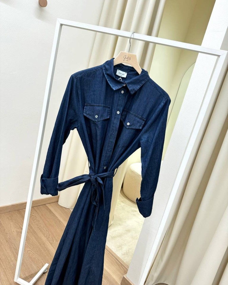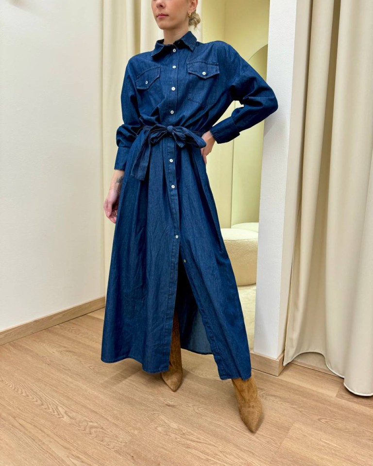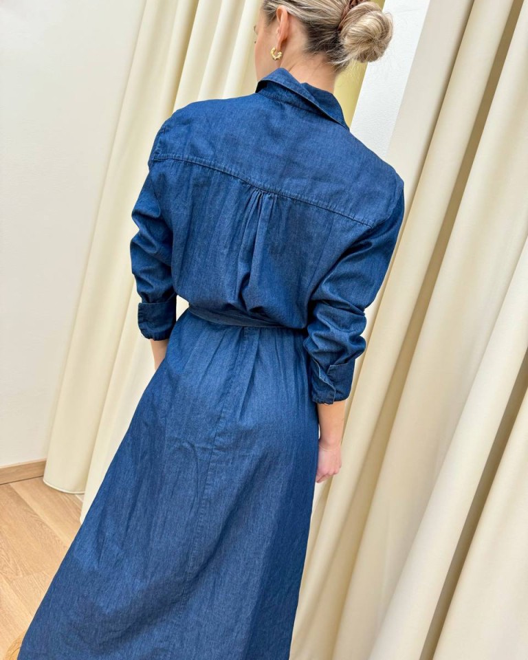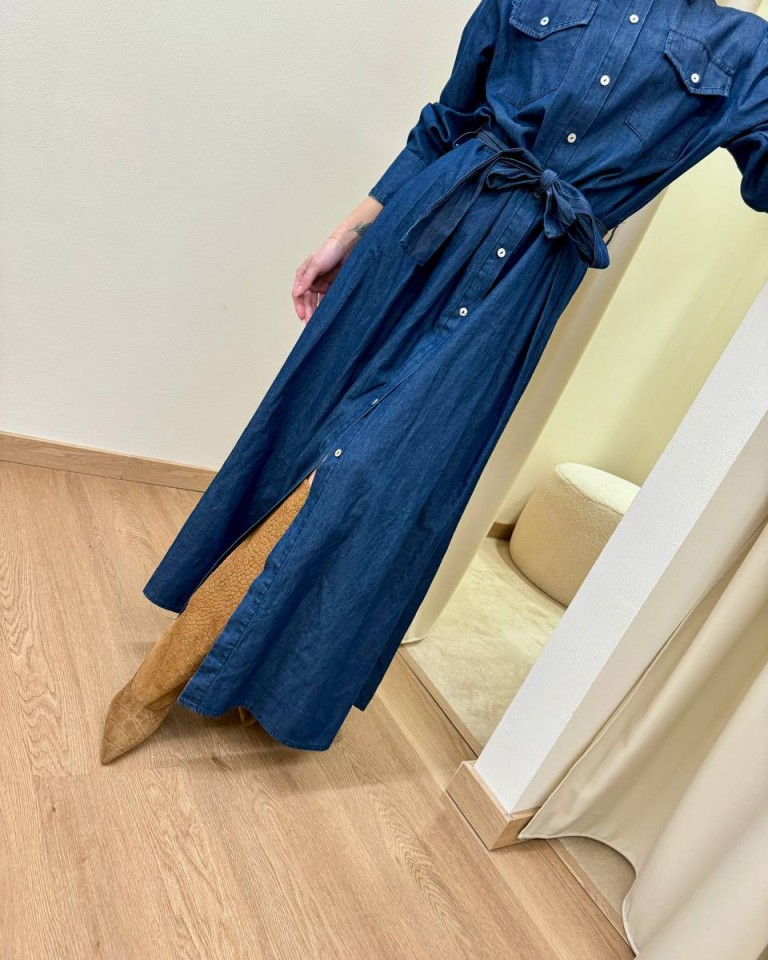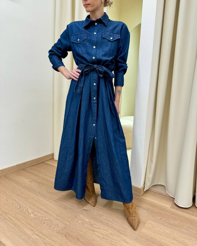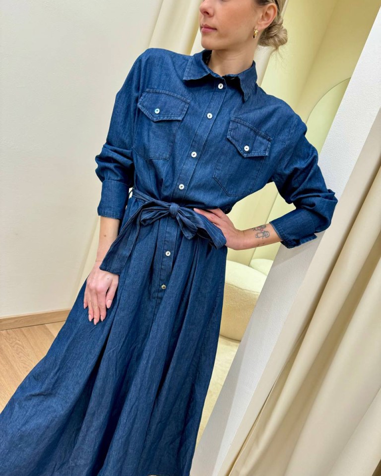 Vestito in chambray blu morbido, modello chemisier lungo con colletto classico, maniche lunghe con polsini a camicia, tasche sul petto, bottoni davanti, fusciacca in vita. Vestibilità regolare.