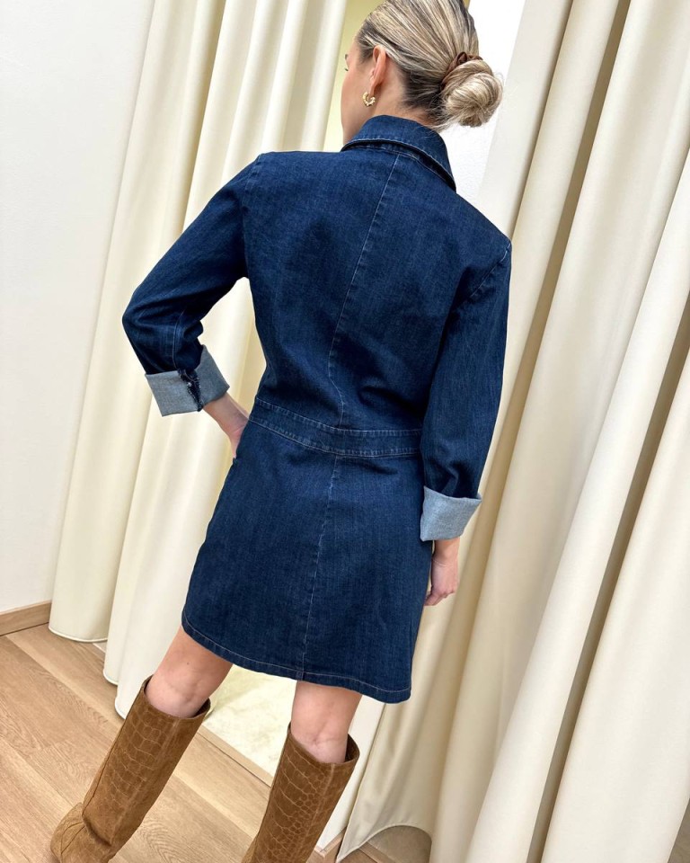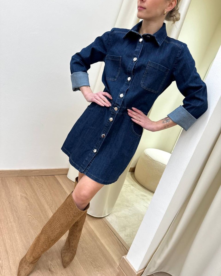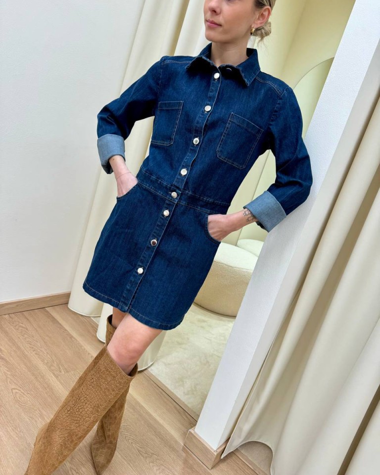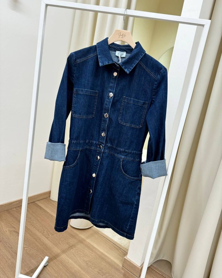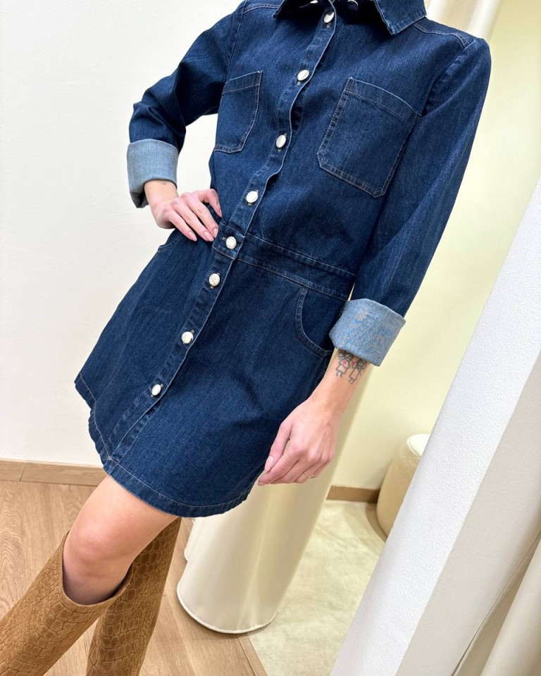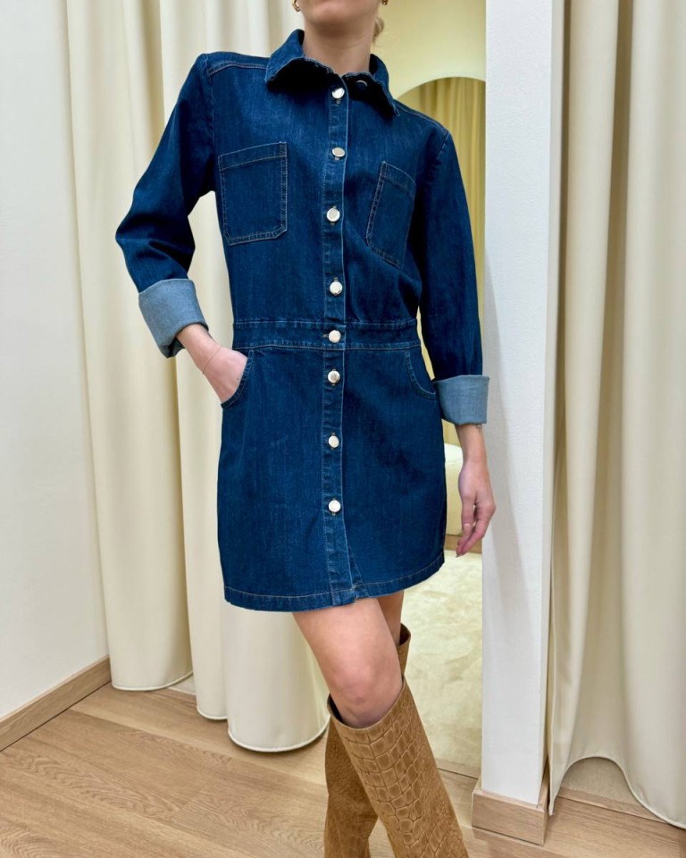 Vestito in denim blu scuro, modello corto con colletto a camicia, manica lunga con polsino e bottone, tasche e abbottonatura con bottoni metallici davanti. Vestibilità regolare.