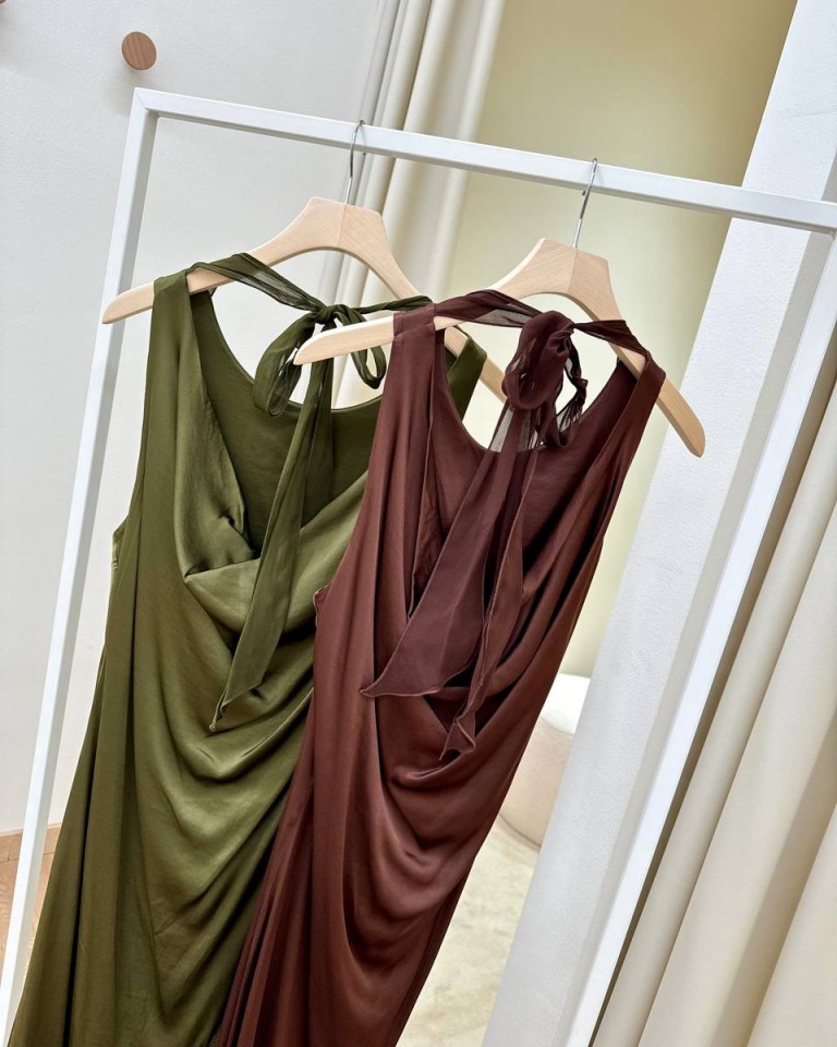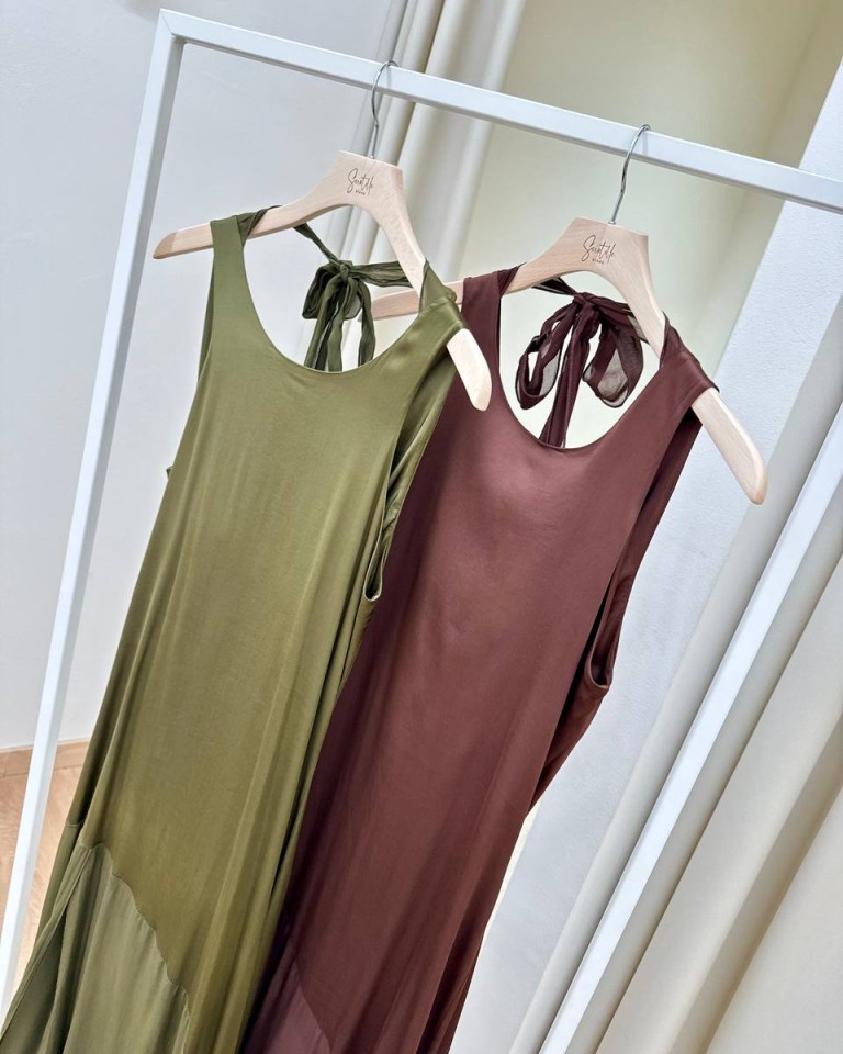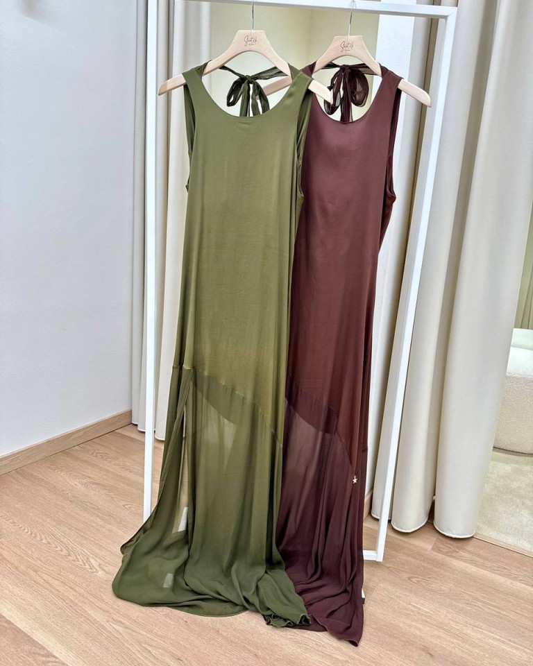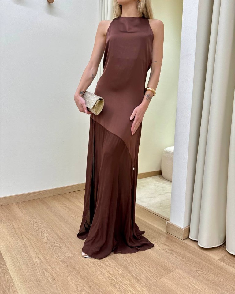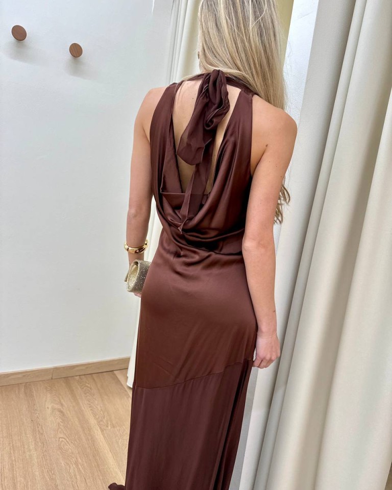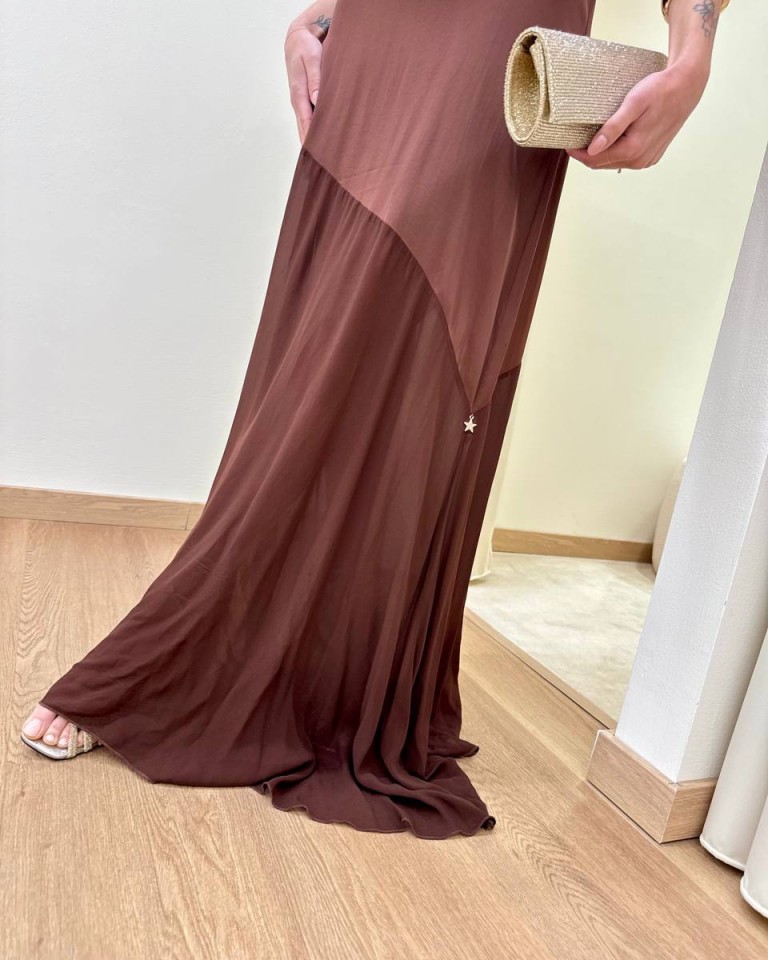 Vestito in viscosa cioccolato, modello lungo, ampio con taglio asimmetrico e fondo semitrasparente con spacco laterale, scollo rotondo davanti e drappeggiato dietro con fiocco sul collo. Vestibilità ampia.